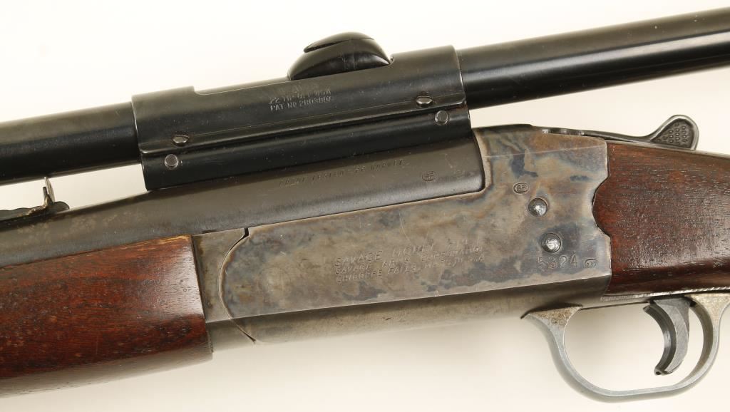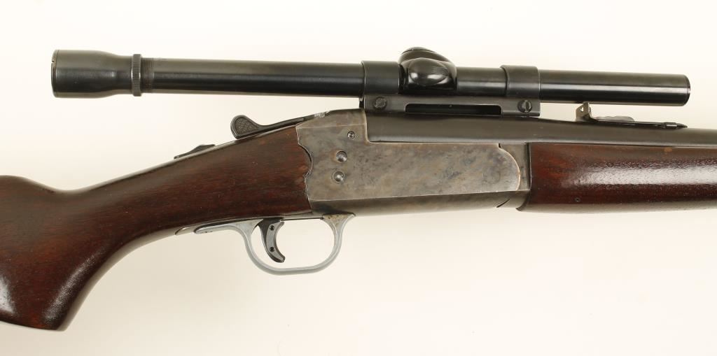 Blued and case-colored single-shot break-action rifle with a 26" barrel, Weaver B6 scope and wood stock. Bluing is faded with freckles under the scope and the case hardening is faded on the exposed areas with the alloy trigger guard gone to a battleship grey color. The bore is mirror bright with good rifling. Action is good with light trigger pull and there is a trigger shoe. Scope has fine crosshairs. Wood stock has a carved representation of what we think is a jaguar on it, there is a sling swivel cut into the butt and a slightly oversized plastic butt plate. Refinished stock is smaller than the receiver and has runs but not many dings or scratches. There is a forward sling swivel on the barrel. Condition is very good. *Modern Firearm*