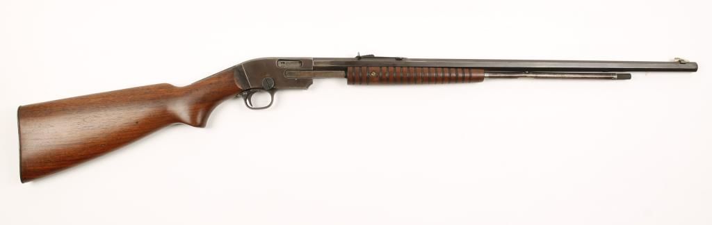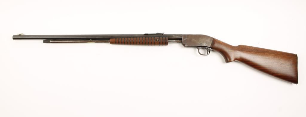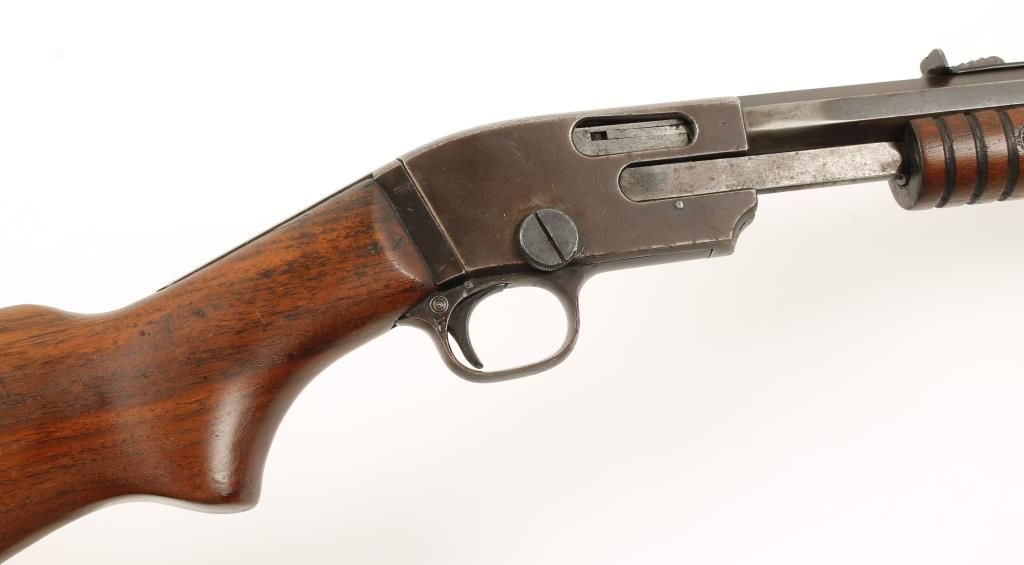 Takedown pump action rifle. Tube feed magazine. Bright bore and good action. 24" octagonal barrel. Forend has a full length crack and may have been repaired. Overall the wood is in good condition for its age. The metal finish is fading to plum/brown/silver. *Modern Firearm* *Curio & Relic*