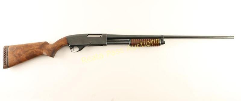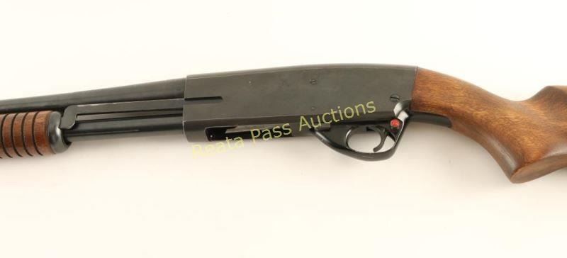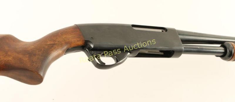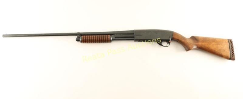 Blued, anodized, pump-action, tube magazine fed shotgun with a 26" barrel, no choke marked, single bead front sight, 3" chamber, alloy trigger guard, hardwood furniture and a recoil pad. Bluing on the barrel has a few small areas of surface rust and some tiny scratches. The bore is shiny. The action works well. The receiver has edge wear and small scratches. The trigger guard has a few scratches and a little edge wear. Forend wood is ribbed and faultless. The butt stock has no deficiencies. The butt plate is an aftermarket that has been poorly fitted. Condition is good. *Modern Firearm*