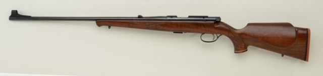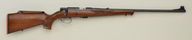 Savage Anchutz Model 54 Sporter in 22 long rifle caliber, serial #1151550A. The rifle remains in fine to excellent condition and a thin line recoil pad has been added to lengthen the stock. 98-99% blue and stockfine to excellent. Robert E. Petersen collection. Est.; $400-$800.