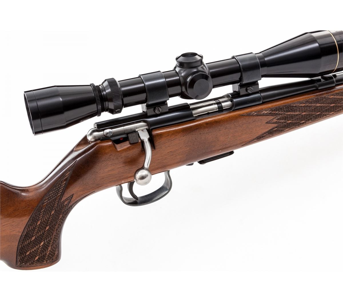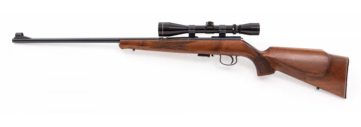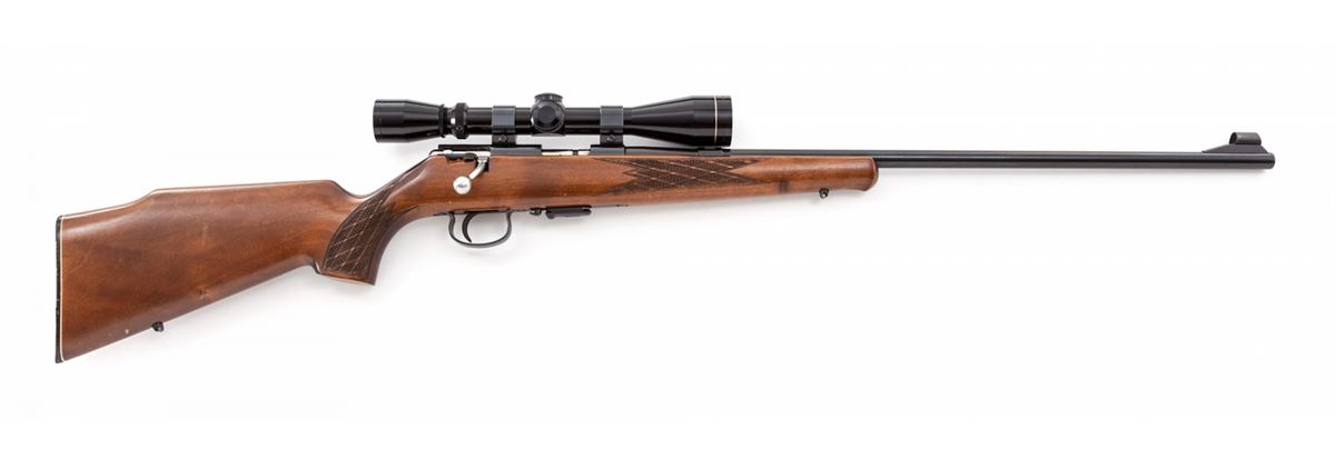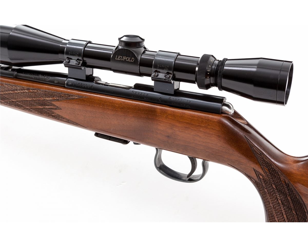 Savage-Anschutz Model 164M Bolt Action Sporter, #1108865A, .22 Win. mag. cal., 24'' barrel, blue finish, factory skipline checkered walnut stock, with one Leupold 3x9 Vari-XII scope on Weaver rings and mounts, and two factory magazines. Mfg'd 1976. Condition is excellent showing just light marks from handling. Est.: $500-$750. (Modern)