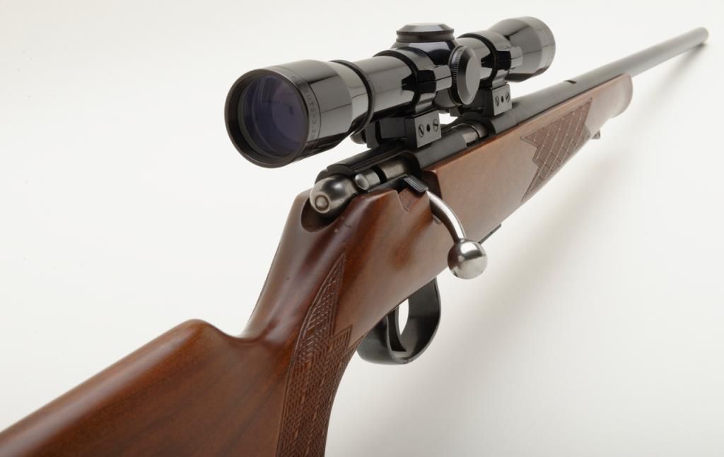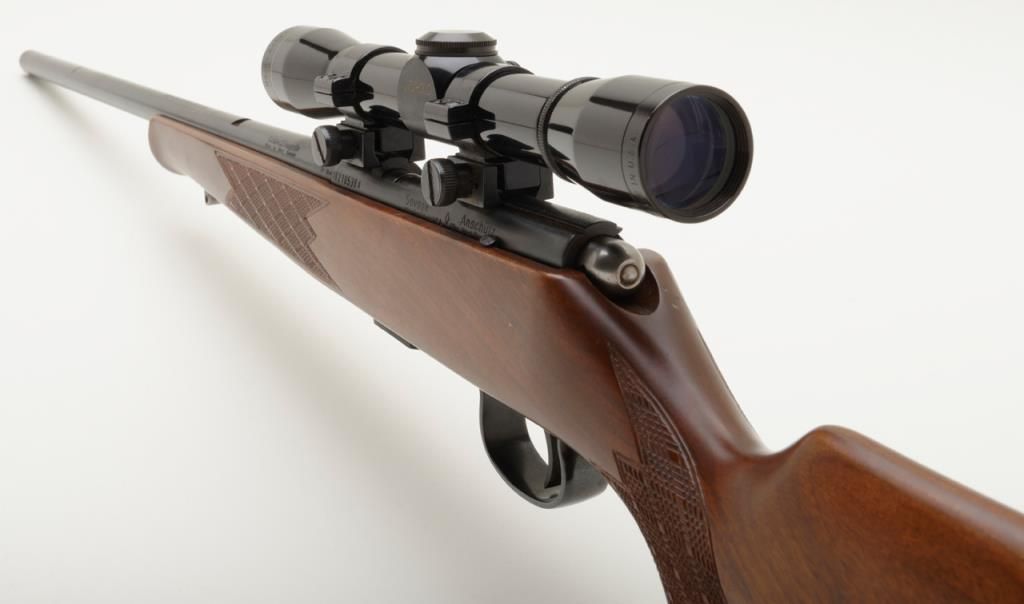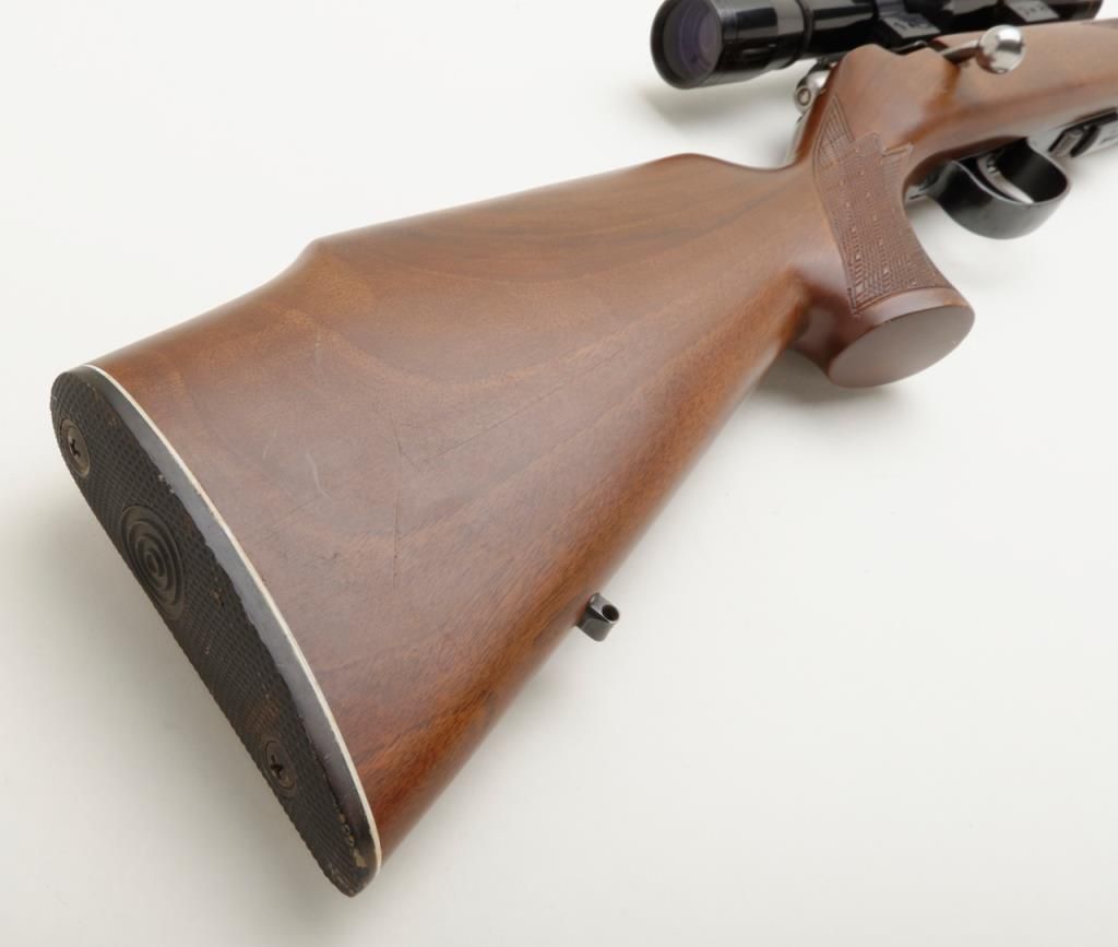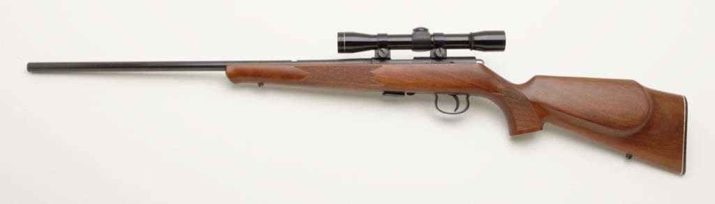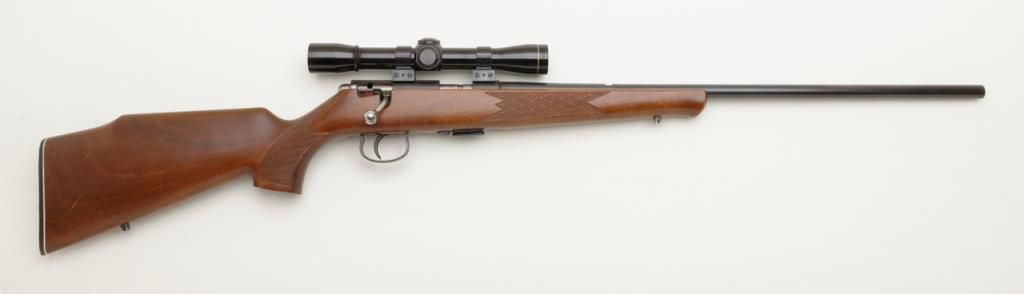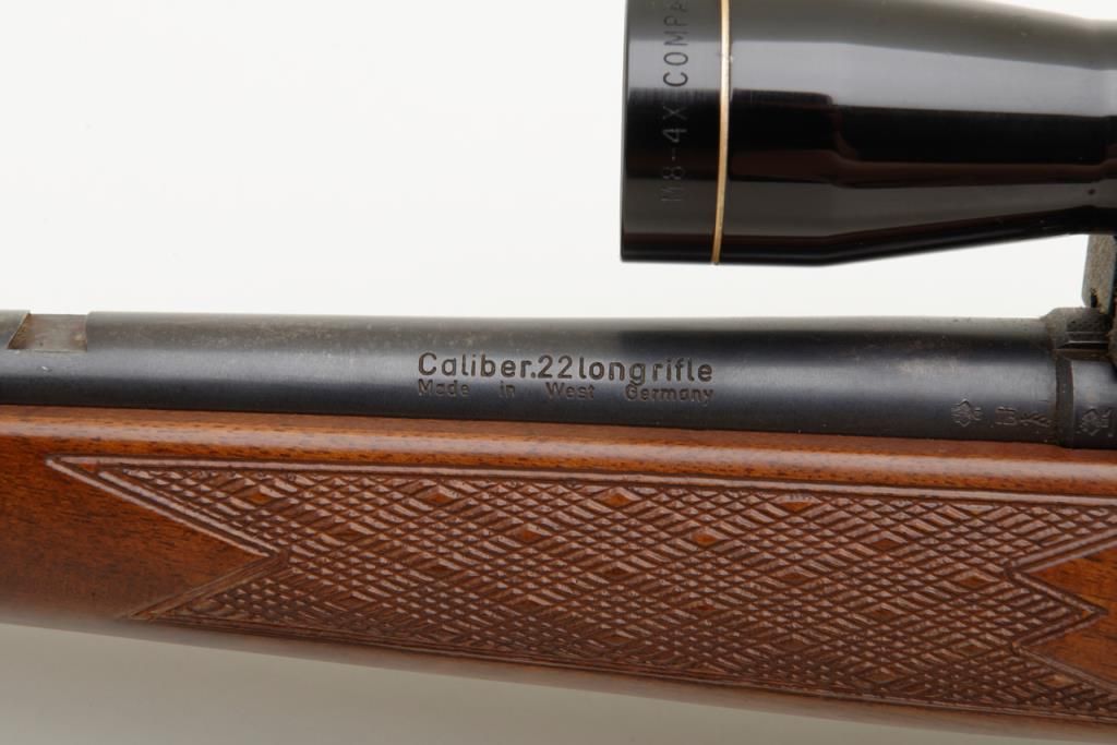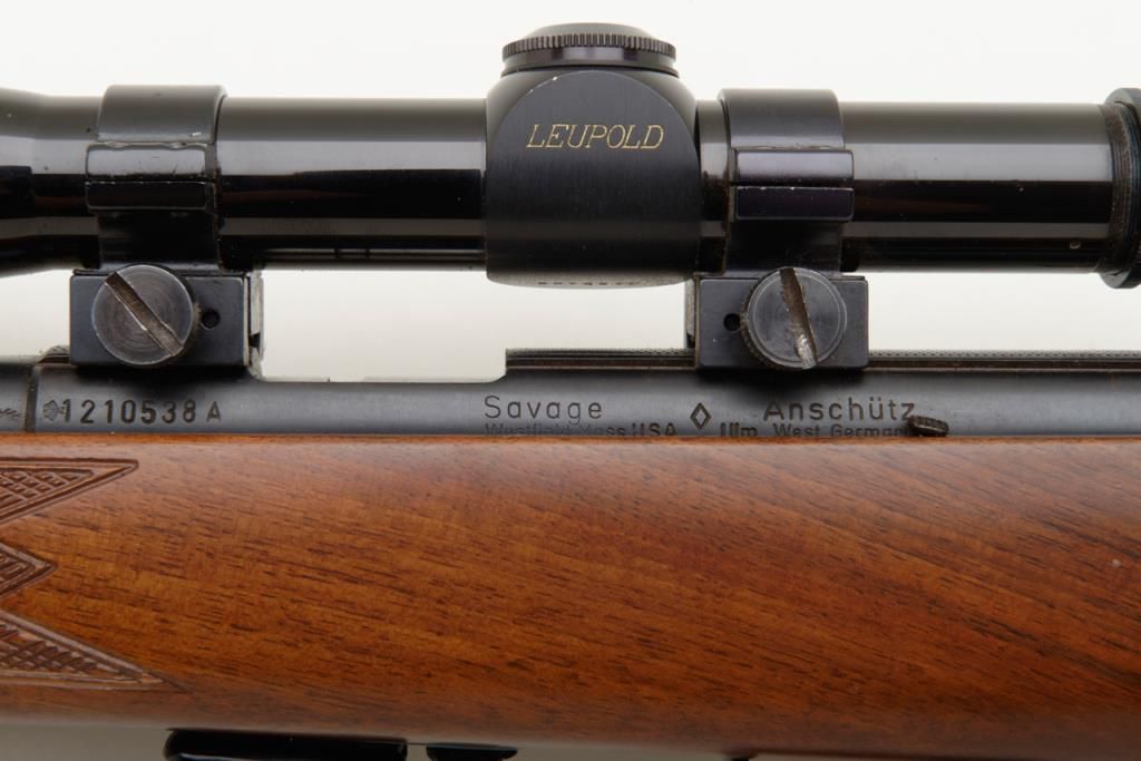 Savage Anschutz made in West Germany Model 164 supporter in .22 long rifle caliber with Leupold scope and detachable rail type mounts. Serial number 1210538A. The rifle shows some thinning on the barrel and about 80% to 90% blue. The stock is fine to near excellent. The action is good and the bore is excellent. Islets for hook type European sling. Est.: $350-$700