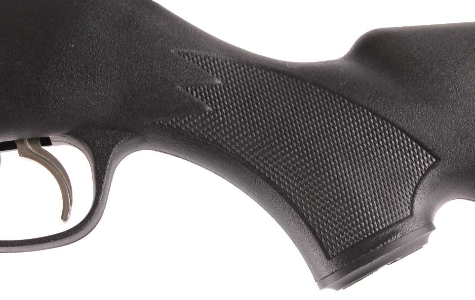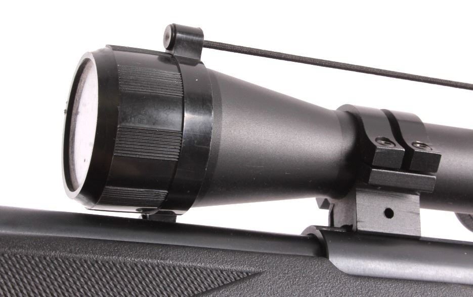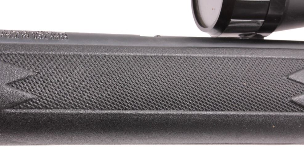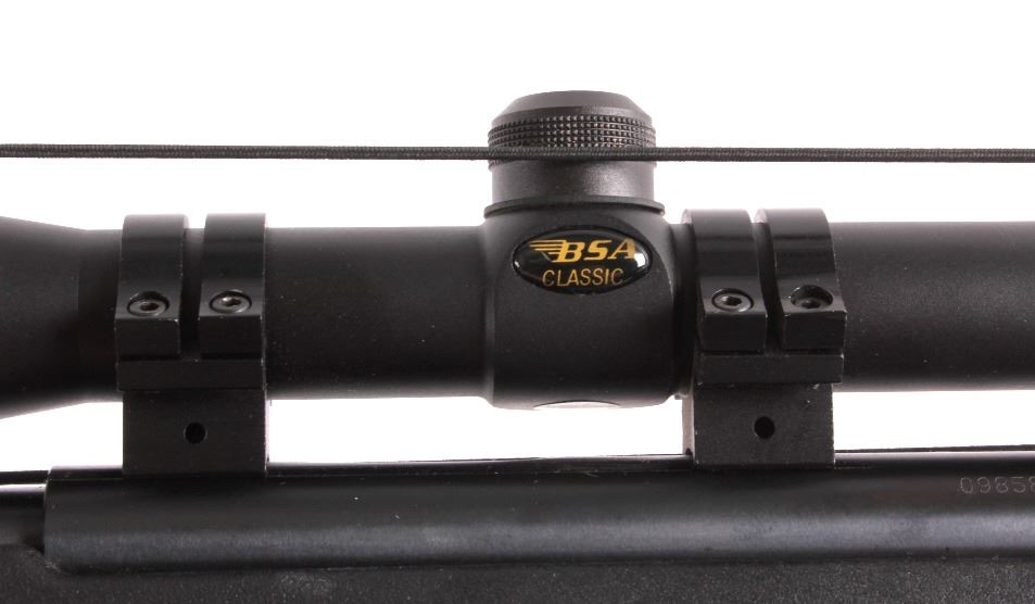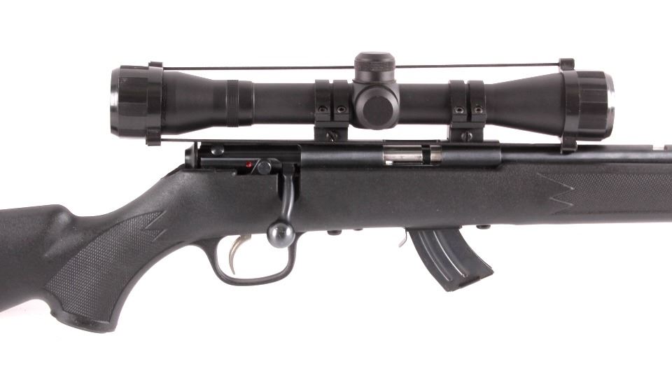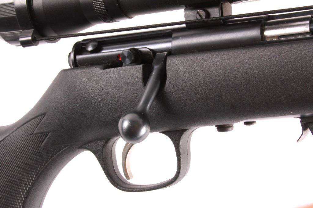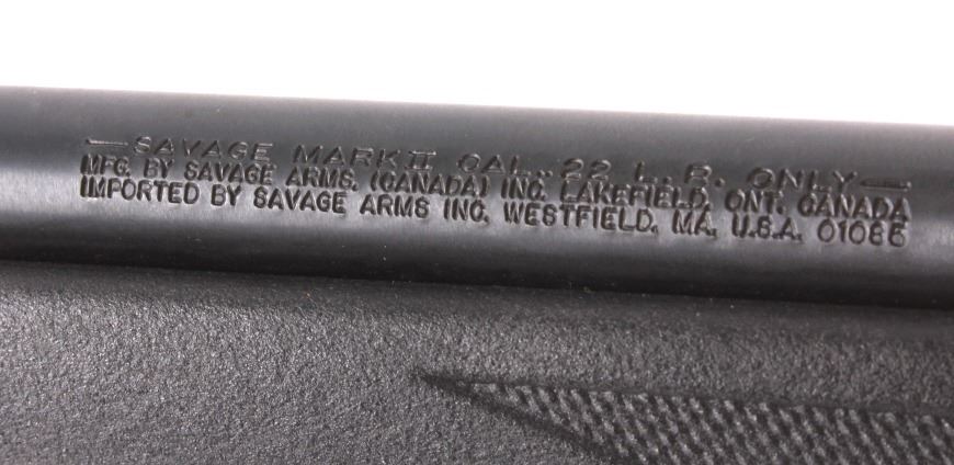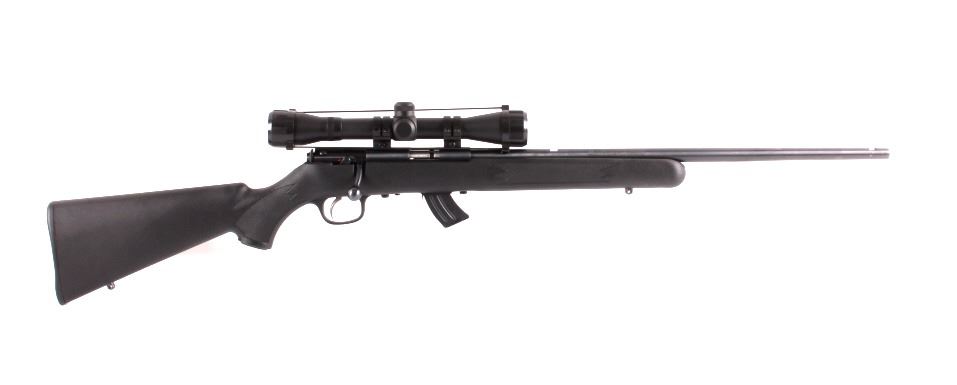 This is a Savage Arms (Canada) Mark II .22 bolt action rifle with scope. The rifle features a synthetic stock with checkered grips. The rifle comes with a BSA 4x32 scope. The rifle shows very good condition. It measures 39.25" long. Serial number 0985872.