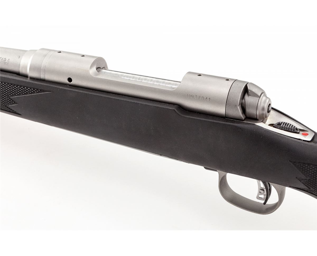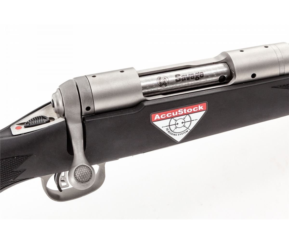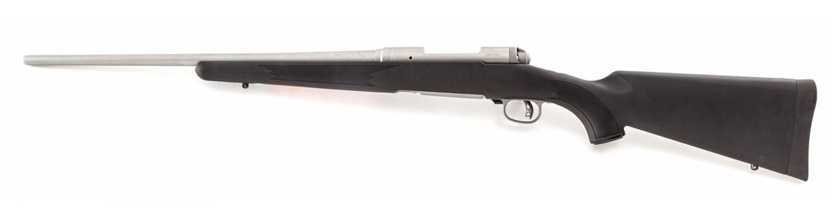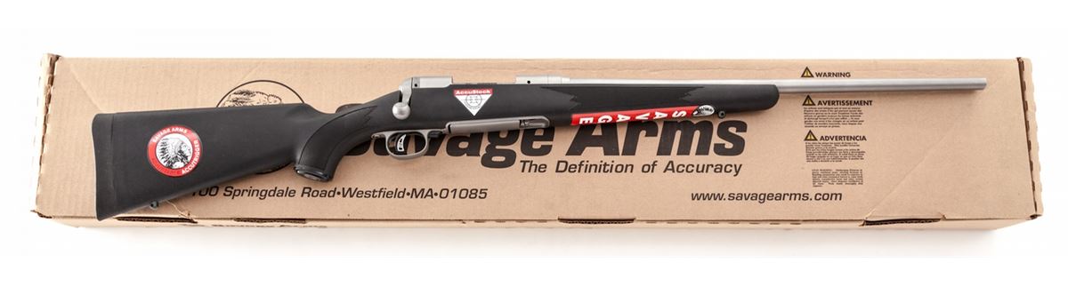 Savage Arms Model 16 FCSS Bolt Action Rifle, #H937041, 6.5 Creedmoor cal., 22'' barrel, stainless steel finish, checkered synthetic black AccuStock, adjustable Accutrigger, with one (1) magazine and gun lock, in box with matching end label and owner's manual. Condition is excellent, remaining new and unfired, with original hang tag and Savage Arms stickers still intact. Box with moderate damage. Retails @ $809.95. Est.: $500-$700. (Modern) (Field Time)