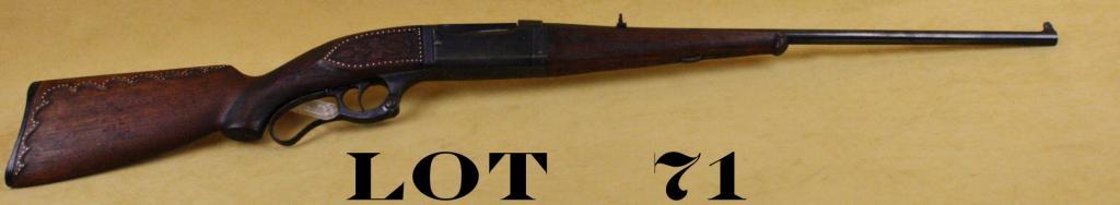 Savage Arms Model 1899 lever action rifle, 250-3000 Savage cal., slightly reduced 21” round barrel, re-blued finish, cartridge counter, customized carved wood stocks with inlaid piercings of what appears to be boneas trim, #175074. This gun is in overall fair + condition as customized and refinished, fair bore, good action, would benefit from a good cleaning. Est.: $300-$500.
