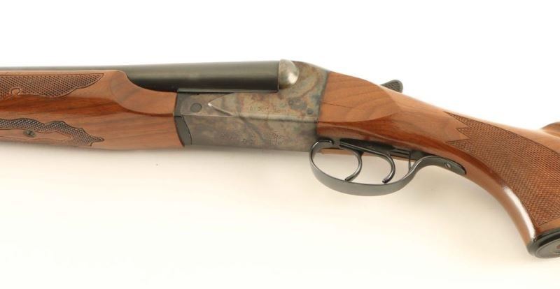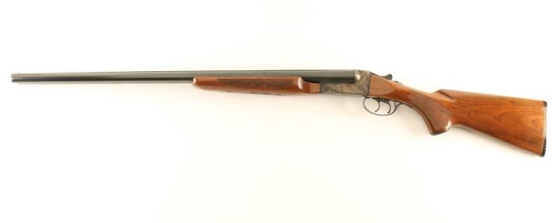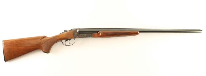Side by side hammerless 12 Gauge shotgun with 28" blued barrels. Silver bead front sight, tang mounted safety, double triggers, case hardened receiver. Small crack in left side of stock behind receiver. Plastic buttplate. NRA Very Good ***Modern Firearm***