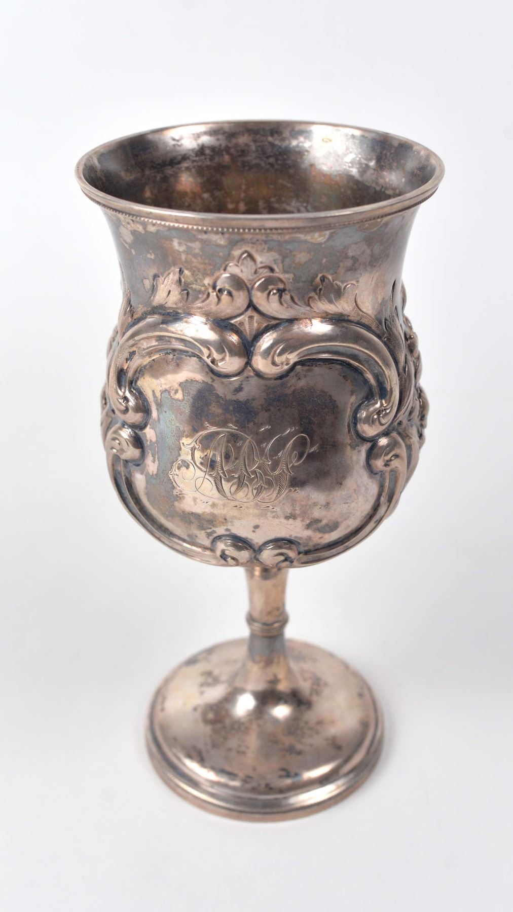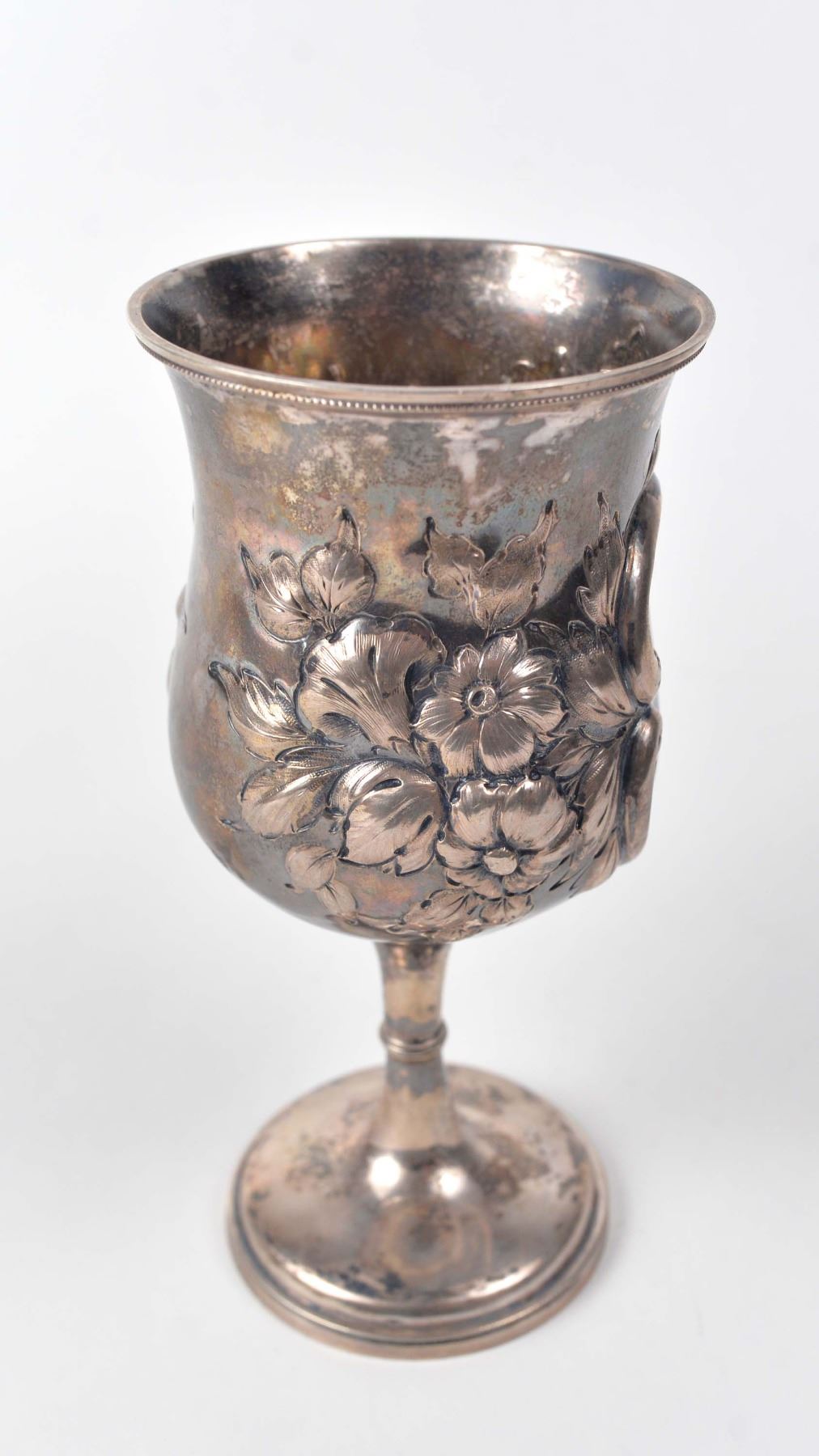 Sterling silver cup with leave and flower design, hallmarks underneath