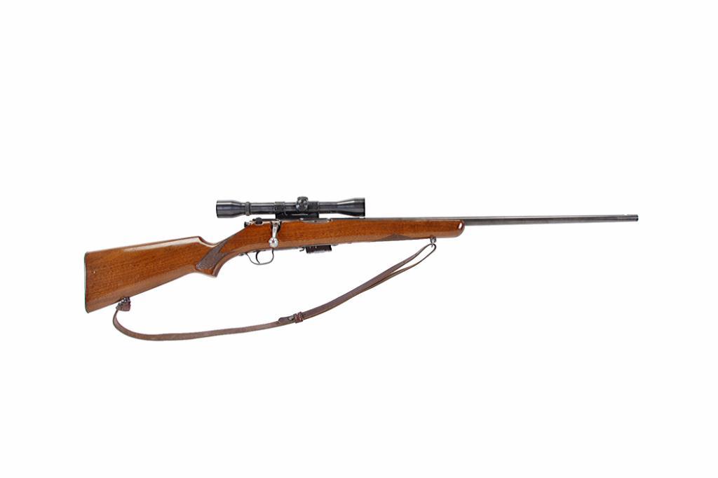 Savage Mdl 23D Cal .22 Hornet SN:217809 Bolt action small caliber hunting rifle. Blued finish, walnut checkered semi-pistol grip stock with steel butt plate and leather sling, 24 1/2" barrel, front and rear sights removed from dovetails to facilitateBolt action small caliber hunting rifle. Blued finish, walnut checkered semi-pistol grip stock with steel butt plate and leather sling, 24 1/2" barrel, front and rear sights removed from dovetails to facilitate low mount Weaver Marksman4X scope. Good bore and action. Condition: Very good, stock appears refinished.