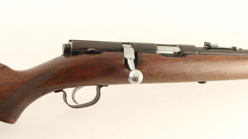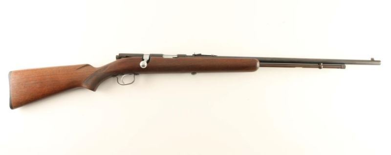 American made bolt action sporting rifle chambered for .22 Short, Long or Long Rifle, manufactured pre-1968. Features a blued finish, 24" barrel, 3/4 length tube magazine, dovetailed blade front sight with brass bead, adjustable rear sporting sight, drilled & tapped receiver, smooth trigger, metal trigger guard, manual safety and plain walnut shoulder stock with checkered pistol grip & serrated hard rubber buttplate. Rifle retains approximately 30% of it's thinned original finish with the balance of the metal surfaces turned to a nice aged brown patina. The action performs well, bore is very good+ and the wood stock is near good with blemishes, worn checkering & 6.5" hairline crack extending from the tip of the forend. Condition is NRA near good. ***C&R Firearm***