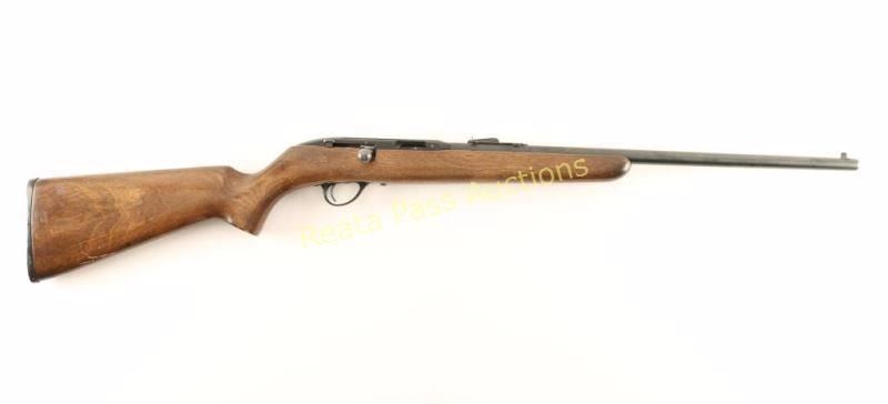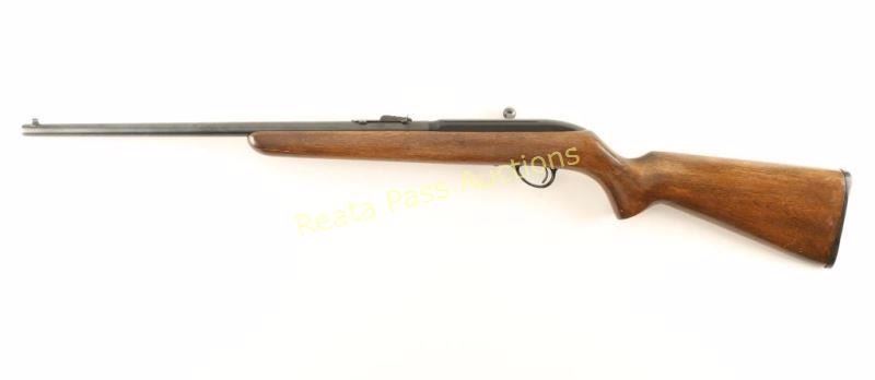Blued, bolt-action, single-shot rifle with a 20" barrel, anodized alloy receiver and trigger guard with a black plastic butt plate. Bluing has a little edge wear at the muzzle, front sight and on the bolt handle. Alloy receiver is made with dovetail for mounting scopes and has a few chips in the finish. Trigger guard has a little edge wear. Bore is bright and shiny with rifling. Action works well. Stock has been refinished and has scrapes and rubs and a crack or two near the forend tip. The buttplate has scratches and rubs. Condition is fair to good. *Modern Firearm*