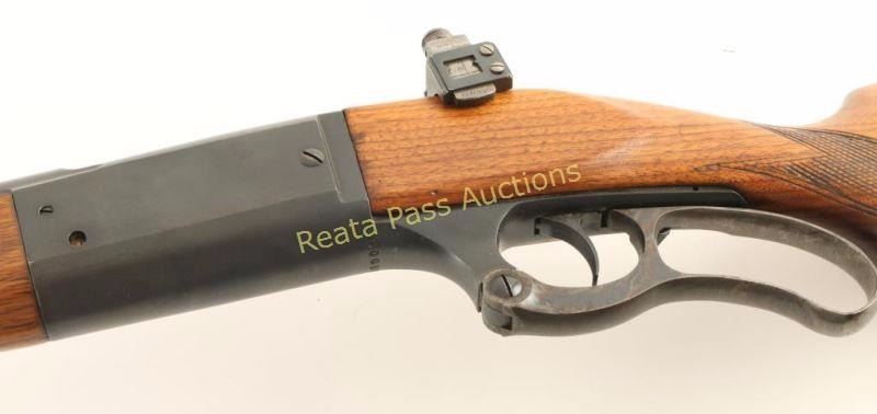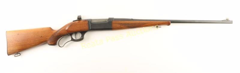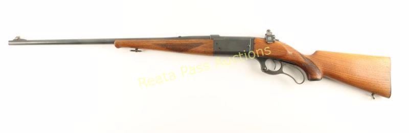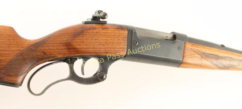 Refinished lever-action repeating rifle chambered in .303 Savage, circa 1937-1938. Featured a matte blued refinish, 24" barrel, ramped blade front sight, blank inserted into rear sight dovetail, Redfield tang-mounted adjustable sight, internal rotary magazine with round counter, case hardened lever, serrated trigger, cocked indicator, sling swivels, manual safety, checkered walnut schnabel forend and pistol grip shoulder stock with serrated metal buttplate. Rifle exhibits approximately 95% of it's matte refinish showing light muzzle wear a small nick on the right side of the receiver and very light handling wear overall. The receiver also shows a couple places where small spots of surface rust are emerging & where light pin prick pitting has occurred. Action is smooth, bore is excellent and refinished wood stocks are good but are shrunken-up along the lower tang & shows cracks around the wrist. Condition is very good as refinished. ***C&R Firearm*** ***Modern Firearm***