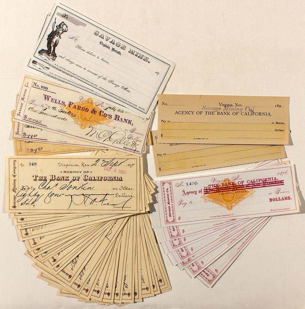 Lot of 38. Includes: 3 RN-G Wells Fargo, 1879, Gillette as supt.; 7 unused RN-G, Bank of California, 1876; 24 Bank of California, no RN, 1897-98, signed by Gorham as supt.; two unused Bank of California, 189-; and two illustrated drafts, c.1870s, unused. Cut cancels and moderate wear. (Prag Collection)