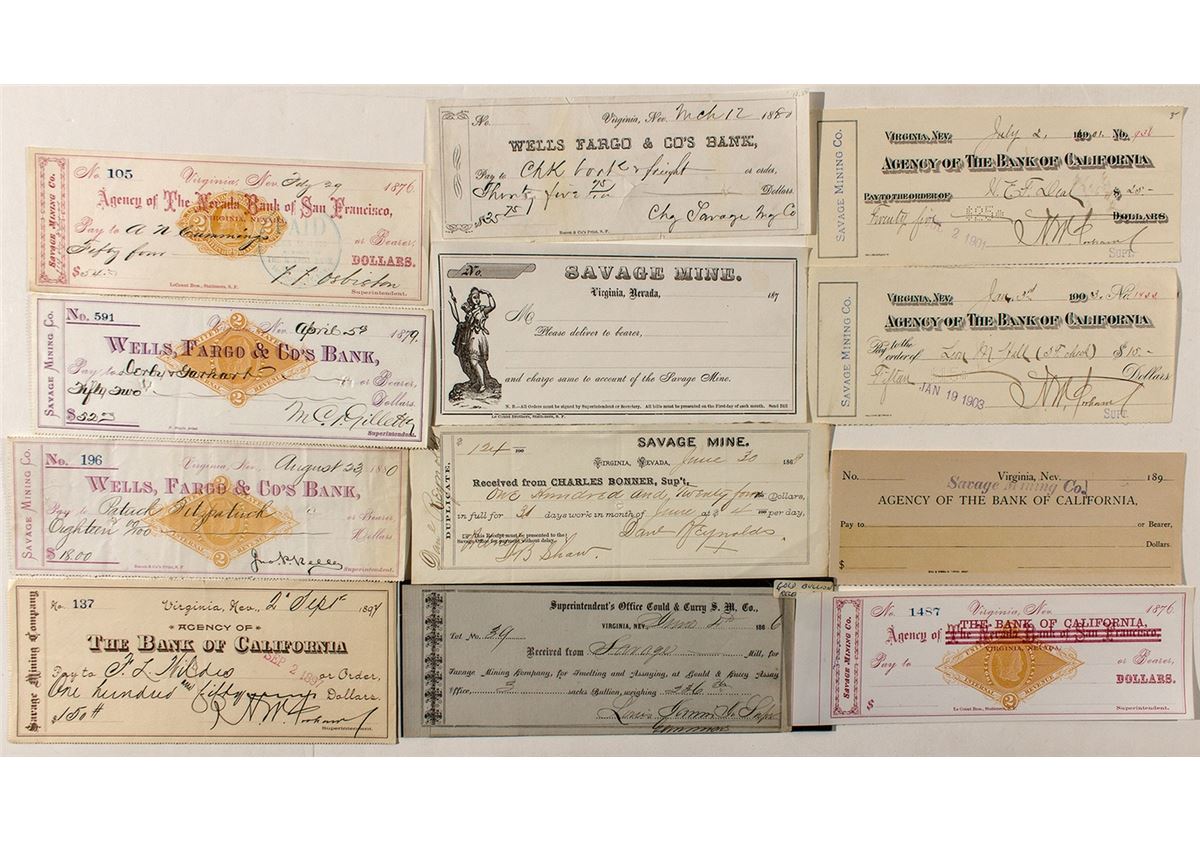 Lot of 12. 1) Gould & Curry Assay Office receipt, 1866, for 3 sacks bullion deposited by the Savage Mill. 2) Four different RN checks: 1876, RN-G, Bank of California, unissued; 1876, RN-F, NV Bank of SF; and two different Wells, Fargo RN-G, 1879 and 1880. 3) Five other Savage check, 4 used. 1880-1903. 4) Payroll receipt, 1868, Charles Bonner supt. 5) Unused Savage draft, c. 1870s. (Prag Collection)