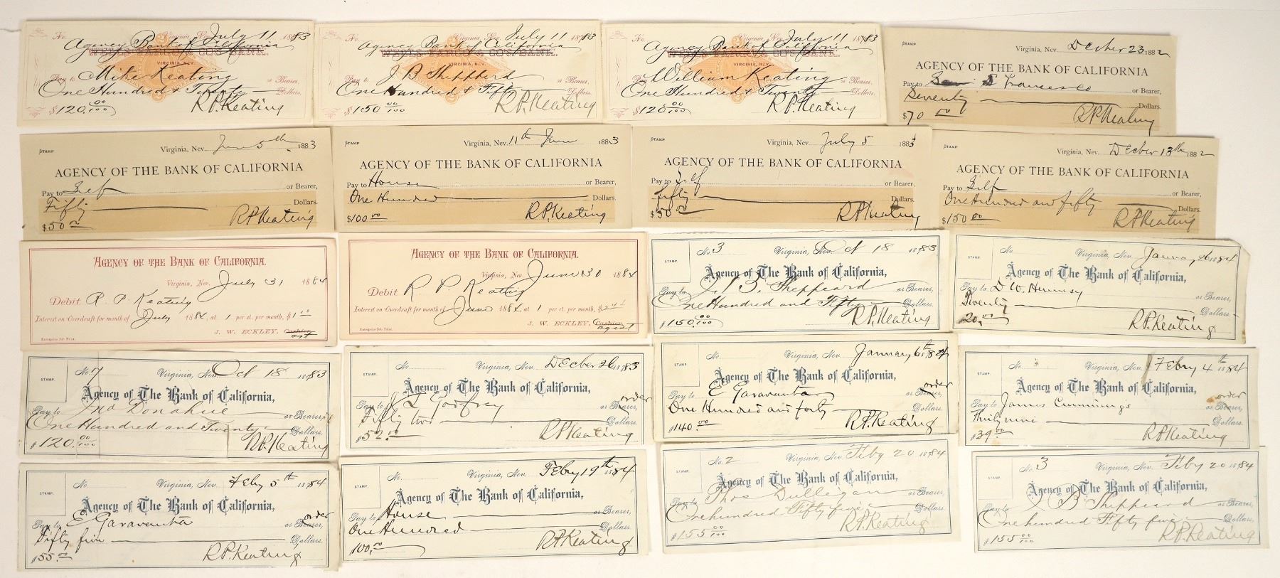 Lot of 20. These are all issued 1882-84, signed by RP Keating as supt. Includes three with RN-G imprinted revenue. All are Bank of California. The Savage Mine, located between Gold Hill and Virginia City, bordered the Gould & Curry to the north and Hale & Norcross to the south. Though separate corporations, Savage and Hale & Norcross shared a closely linked history, facing similar challenges and successes under the supervision of James G. Fair in the 1870s and R. P. Keating in the 1880s. They regularly exchanged resources and workers, and in 1875 cooperated with neighboring companies to sink the Chollar-Norcross-Savage Shaft. Later, in the 1890s, after the discovery of the Brunswick Lode, they joined forces with several other major Comstock mines to dig another large shaft.