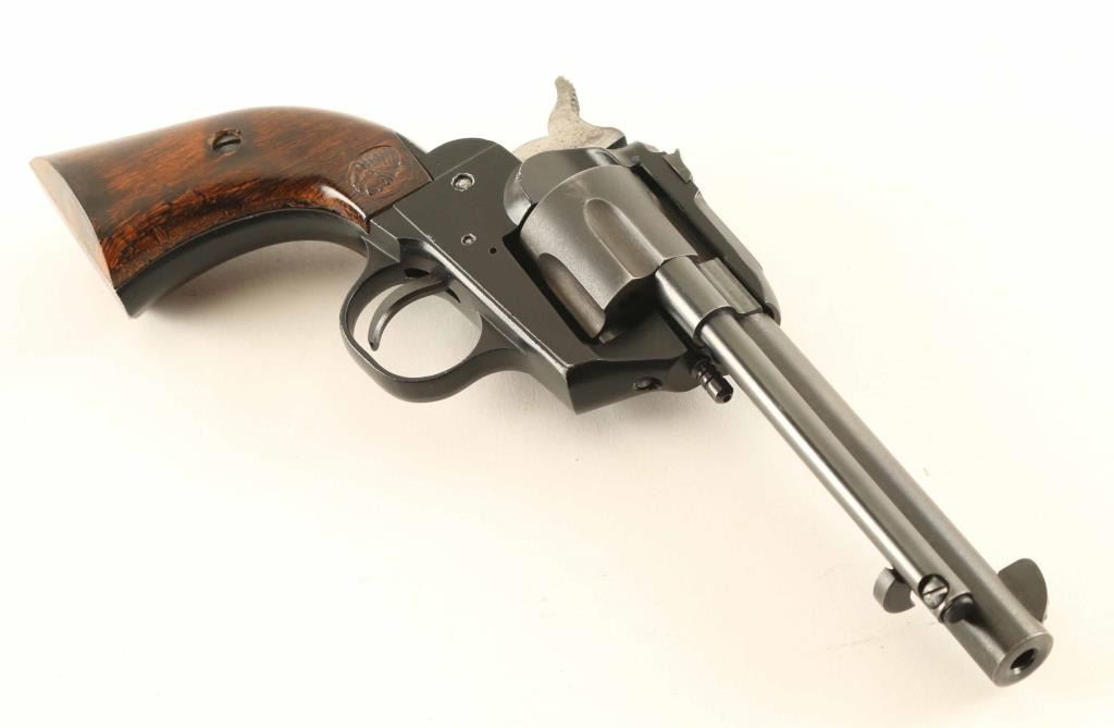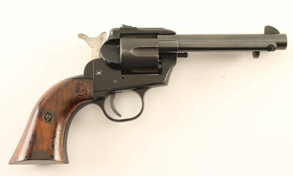 Pistol, Single-shot. Appears to a traditional 6-shot revolver. It is a single-shot with dummy cylinder. the barrel, and cylinder swing to the right to show breech for loading/ejection. The ejector rod is used by thumb button under the left side of barrel. The frame/cylinder are die-cast alloy. barrel and other parts are steel. Grips are laminated walnut colored wood, with Indian head design. 4 1/2 " barrel. Bore is excellent/bright. Matte-black frame, blued barrel, and gray cylinder. Chrome hammer. One-click action locks up tight. Finish is about 99%, with a couple of minor scratches. grips are in great shape. An usual design. great starter handgun for the kids. NRA Condition-Very good. Modern Firearm.