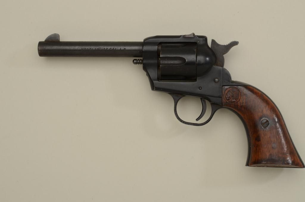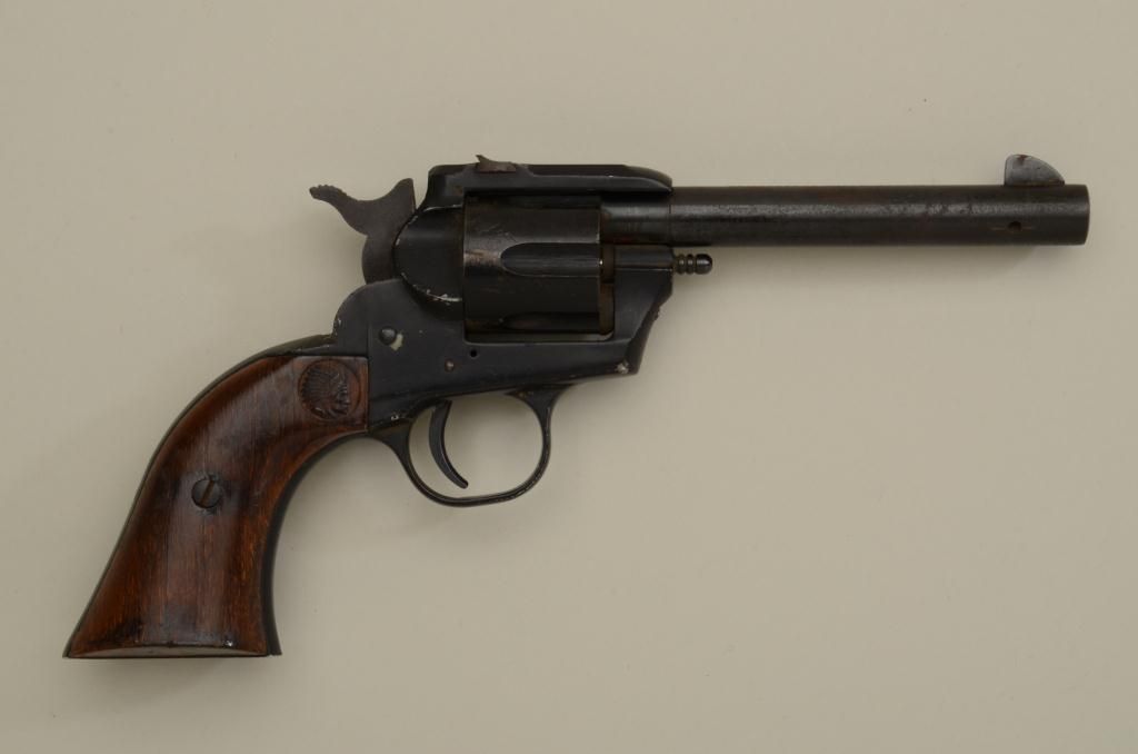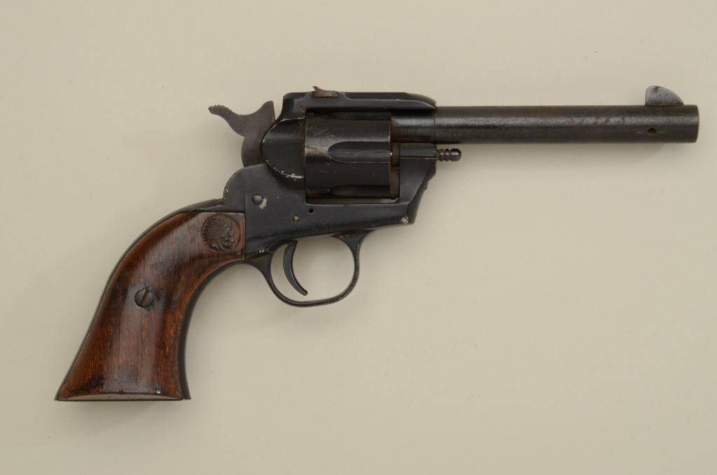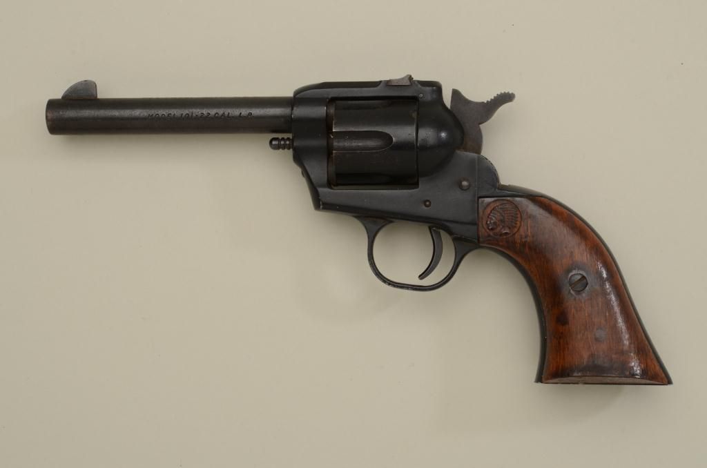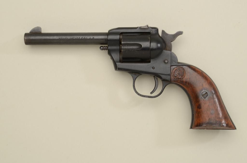 Savage Model 101 single shot pistol in the design of a diminutive SAA revolver, .22LR cal., 4-1/4” barrel, black finish, wood grips, #52868 in overall good condition. Est.: $50-$100.