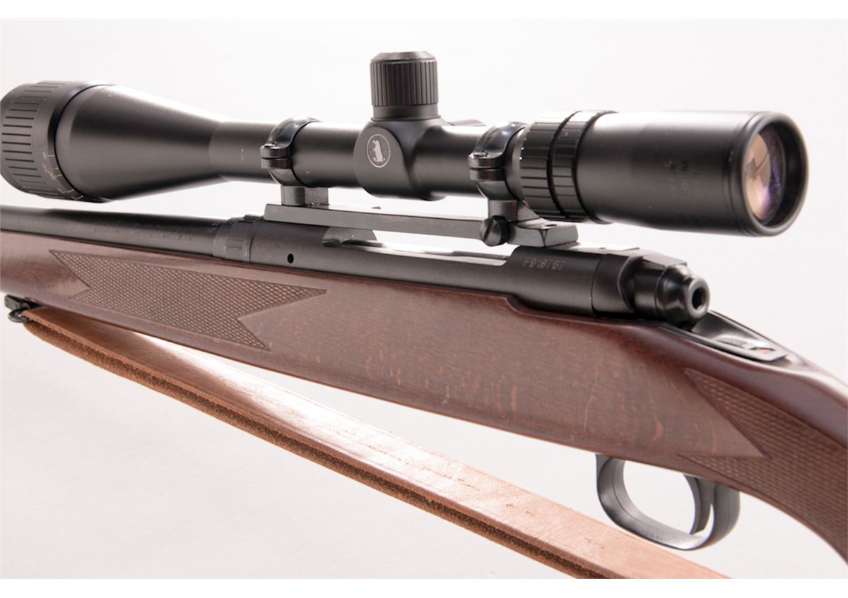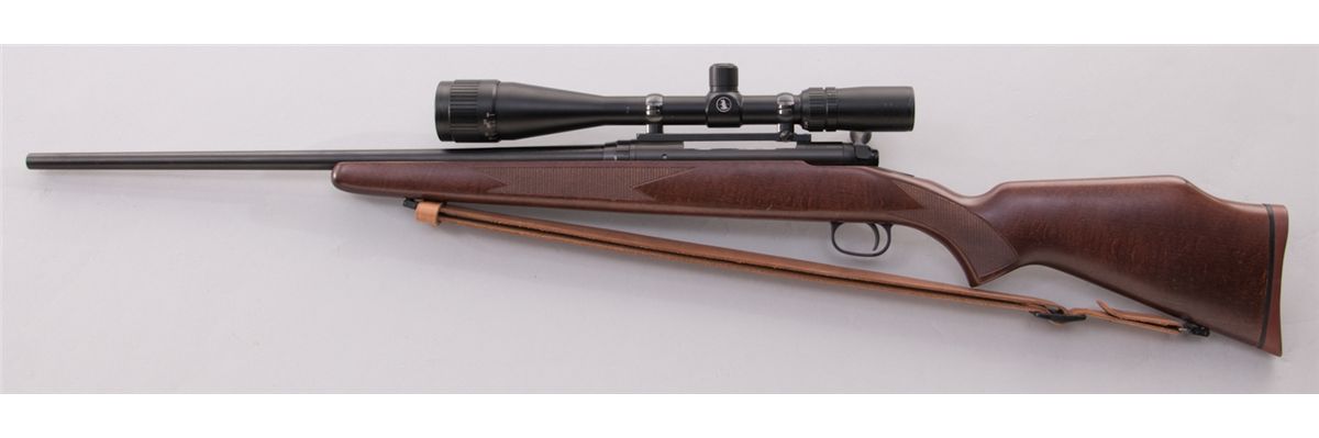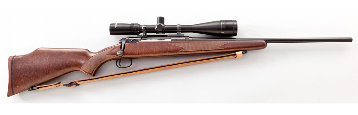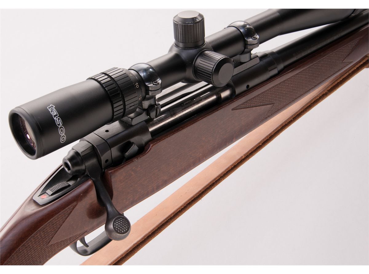 Savage Model 110 Bolt Action Rifle, #F918767, .308 Win. cal., 22'' barrel, blue finish, dark stained checkered birch stock with factory red rubber butt pad, leather sling, topped with a Tasco 6-24x Varmint scope. Condition is excellent, appearing new and unfired, with only the slightest marks from handling. Est.: $450-$600. (Modern)