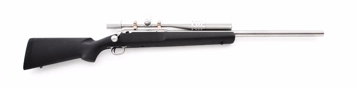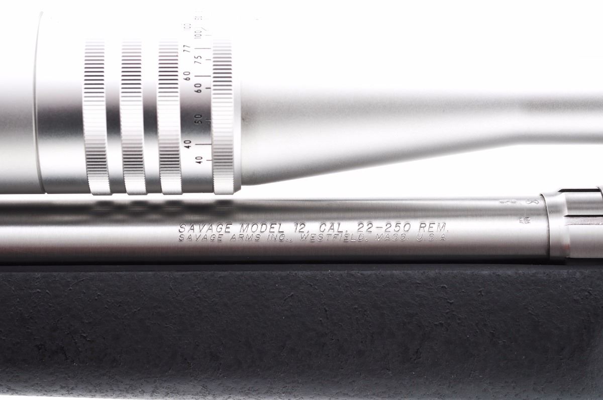 Savage Model 12FVSS-S Single Shot Bolt Action Rifle, #G502510, .22-250 cal., 26'' heavy barrel, stainless steel, left side ejection port, textured black synthetic pistol-grip stock, HS Precision black rubber recoil pad, AccuTrigger, with sling swivel studs. Topped with a Weaver CT36 Micro-Trac scope on two-piece base and rings. Condition is excellent showing just light marks from handling. Action is crisp, bore is bright, scope optics are bright and clear. Est.: $400-$600. (Modern) B&W