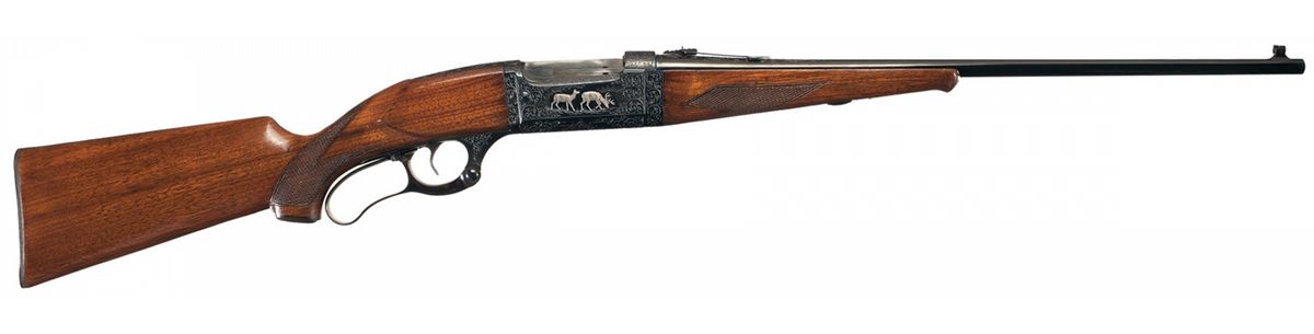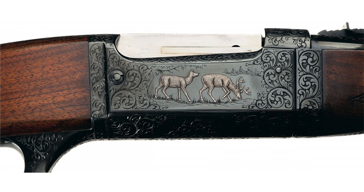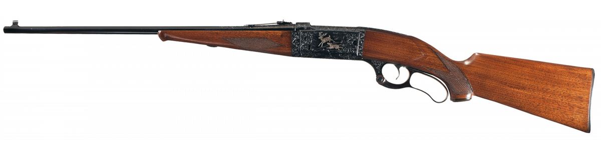 Manufactured between 1914 and 1921 with standard markings. Pinned blade front sight and adjustable ramp rear sight. Light scrolled engraving on part of the barrel, receiver, upper tang and part of trigger guard. Receiver has a silver accent dog chasing a deer on left side and two silver accent deer on the right. Cocking indicator, polished bolt and checkered Schnabel forearm and pistol grip stock with checkered hard rubber grip cap and serrated steel buttplate stamped with the Savage Indian head logo. With a two-piece RCBS die set for reloading .250-3000 Savage.