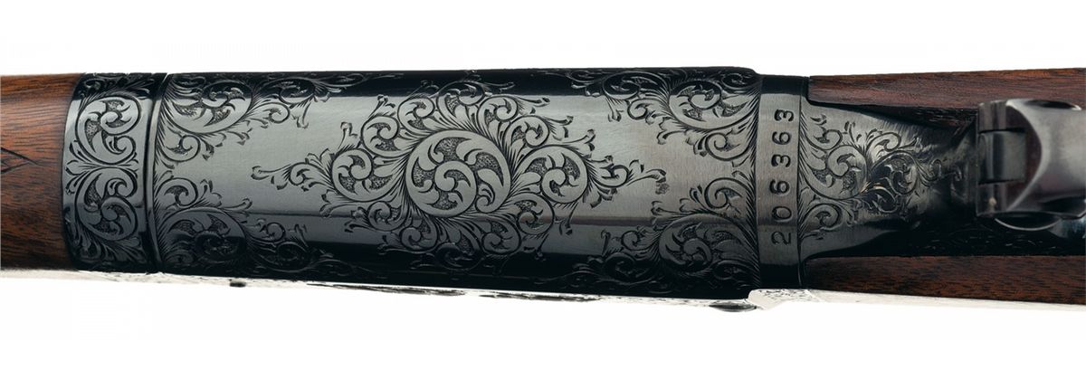 Condition: Professionally embellished with 99% plus blue finish, showing light scattered handling marks. The stock is excellent with light scattered scratches and handling marks. The action is crisp. Dies are very good.