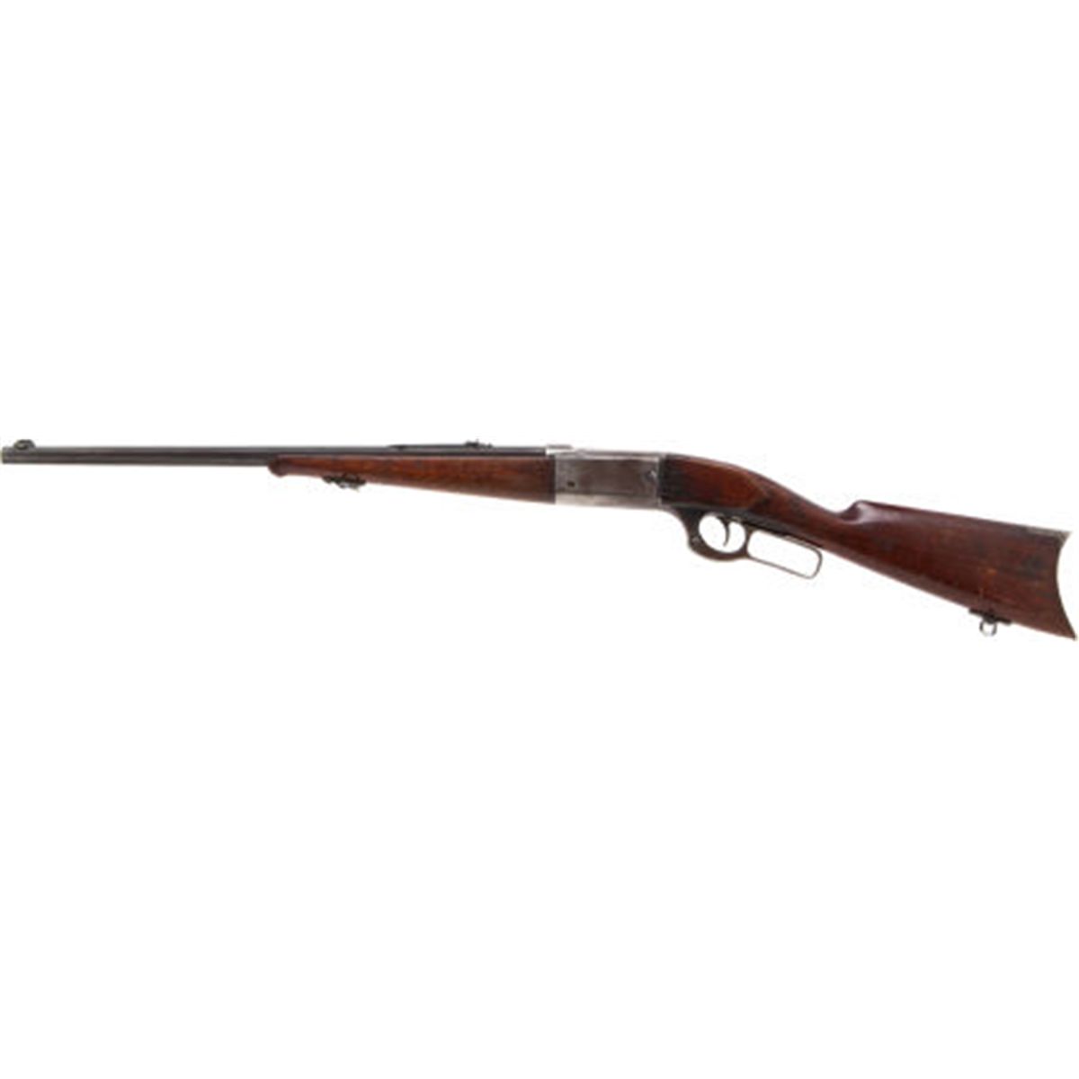 Savage Model 1899 Lever Action Rifle. Serial no. 73.057, .303 caliber, 22-inch octagonal barrel with elongated bead front sight and long elevation rear sight. Blued finish. Varnished walnut stock and fore-end. Sling mounts. Condition: Good. Retaining approximately 30-40% finish, primarily on barrel with scattered wear, frosting and patina. Wood with wear and bruises. Deep gouge on right side of buttstock at frame and hairline crack on left. Action good. Bright bore. NRA FIREARMS FOR FREEDOM PROGRAM