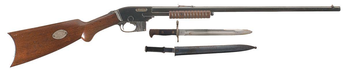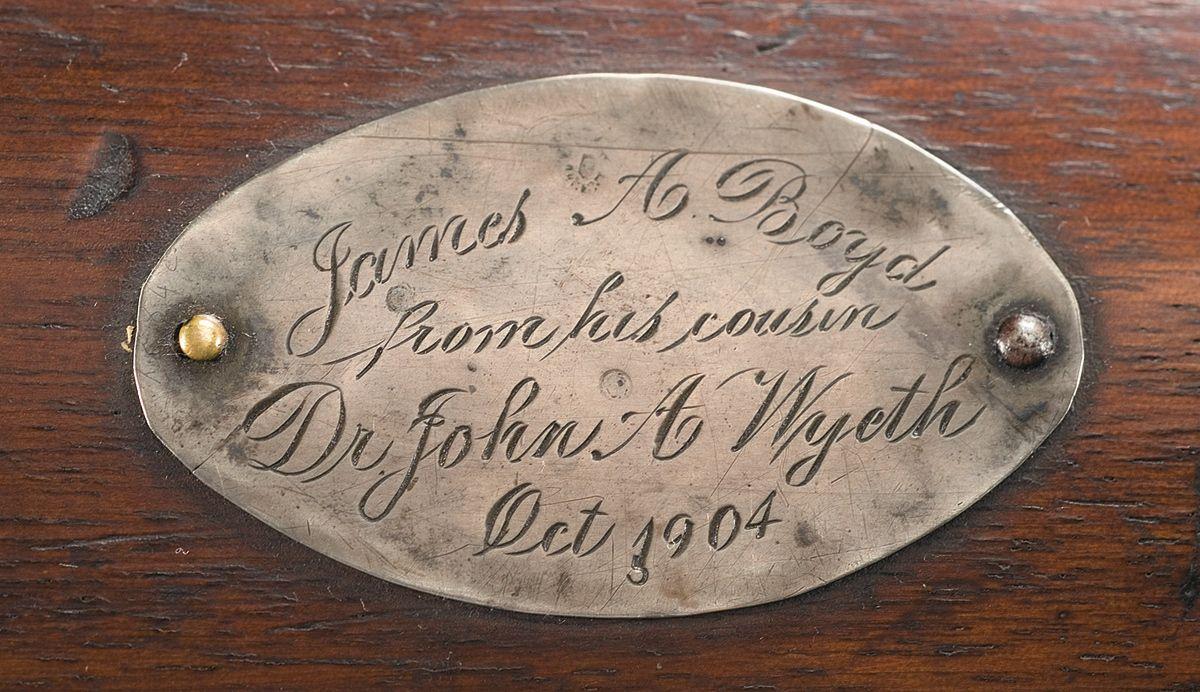 Standard markings and features with a presentation plaque that reads: "James A Boyd/ from his cousin/Dr John A Wyeth/ October 1904". A brief internet search uncovered a Dr. John A Wyeth who was a respected Soldier and Surgeon in the Civil War although it is uncertain if it is the same man who presented this rifle. Also with a Krag bayonet and scabbard.