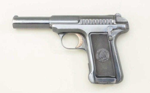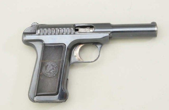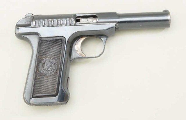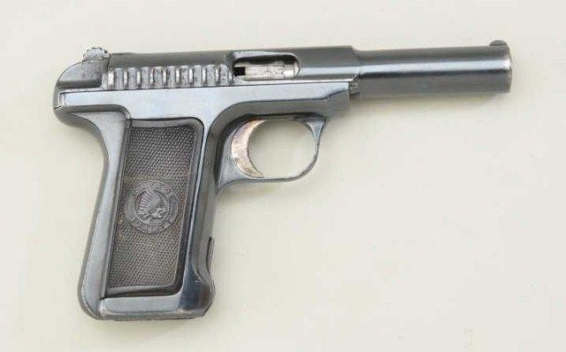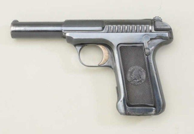Savage Model 1907 .380 semi-auto pistol blued finish, hard rubber grips, serial #B2111 with factory letter dating mfg at Feb. 27th 1913 and telling the story of the Savage pistol being invented by EH Searle who was an ordinance officer at Springfield Armory. It is said that these pistols could empty the magazine faster than any other pistol of the era and hence the marketing slogan “Ten shots quick” The pistol remains in near fineoriginal condition with 90-95% original blue some slight losses at muzzle and edges, very good grips, good action, good bore, sharp markings. Est.; $500.-$1,000.