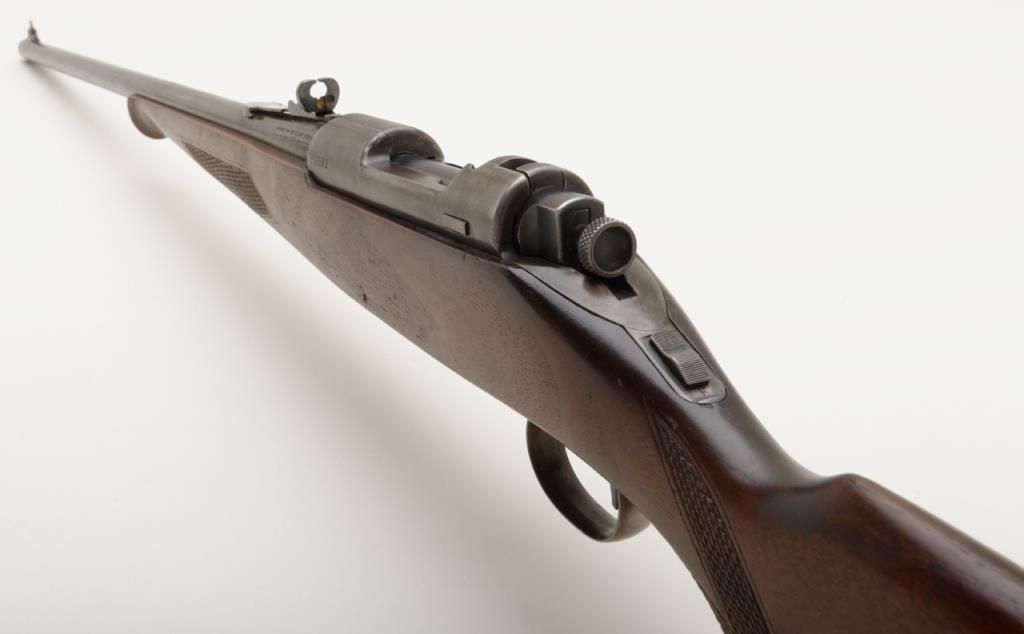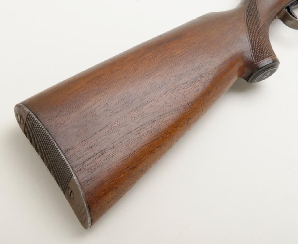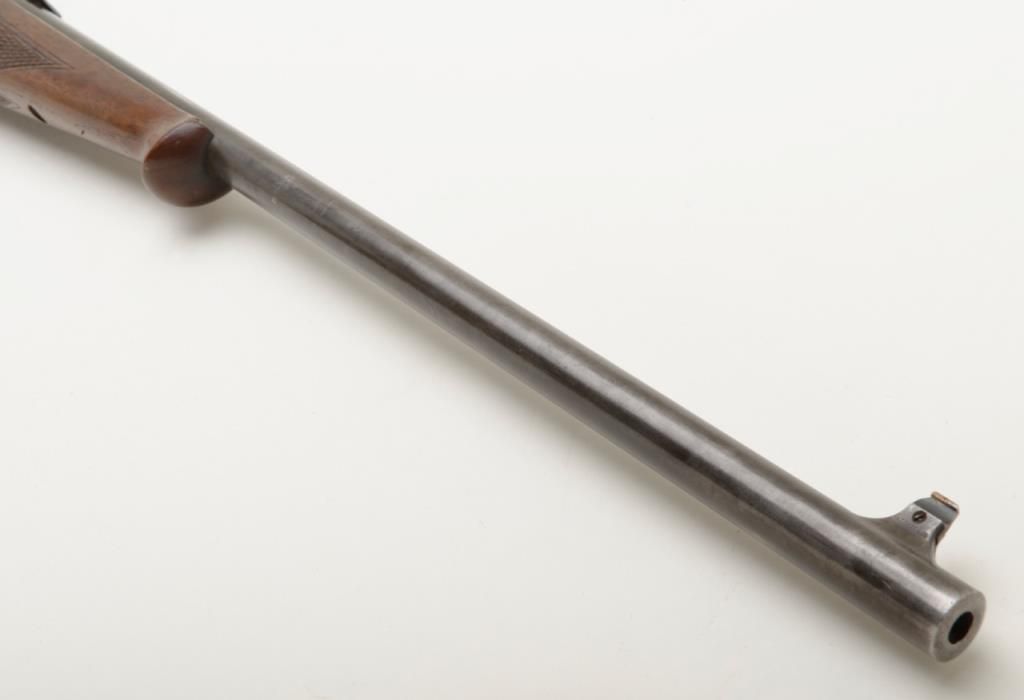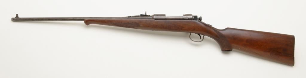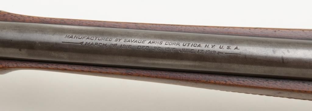 Savage Model 1920 bolt action sporting rifle in .250-3000 caliber remaining in good to very good original condition, serial number 2811. The metal surfaces show a gray to brown patina finish with some traces of original blue mixed in. There is some slight beginning erosion and natural aging. The stocks are good with fairly crisp checkering and some minor dings, mars, slight scratches and a little professional cleaning but no sanding. The rifle has been mounted with King marked sights which are of the period and in the correct positions. The action is good and the bore is at least very good and bright which may clean nicely. Est.: $250-$500
