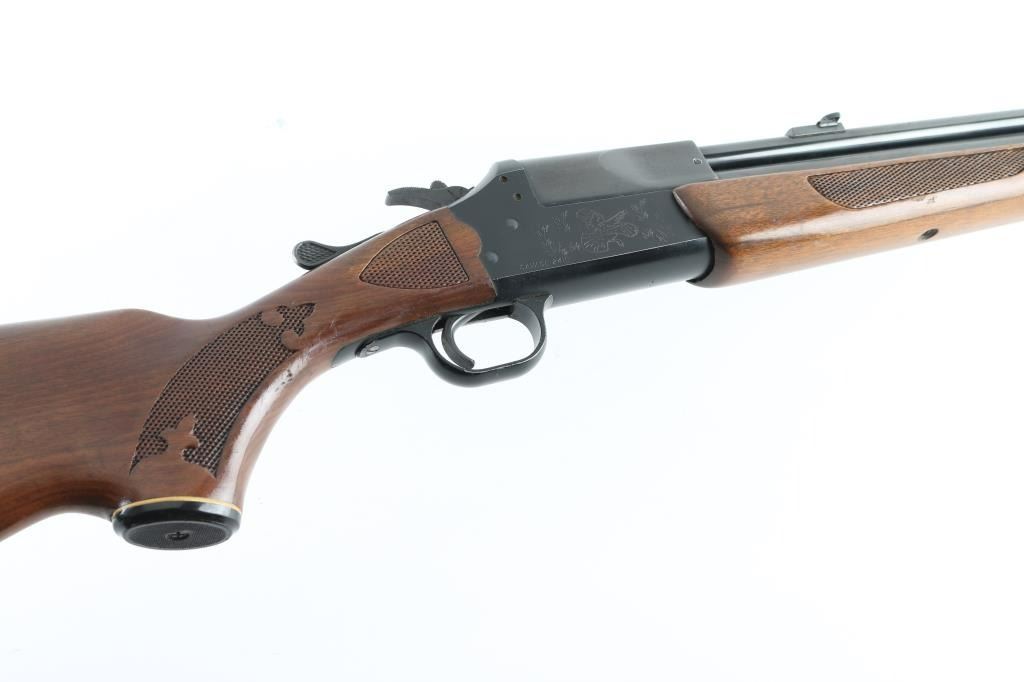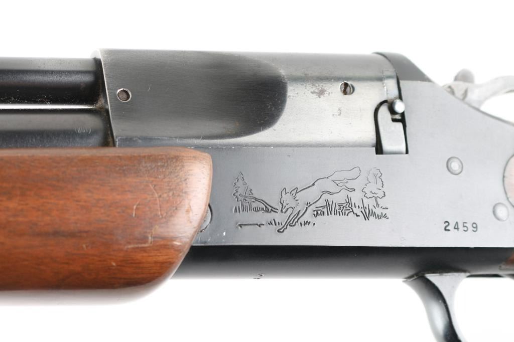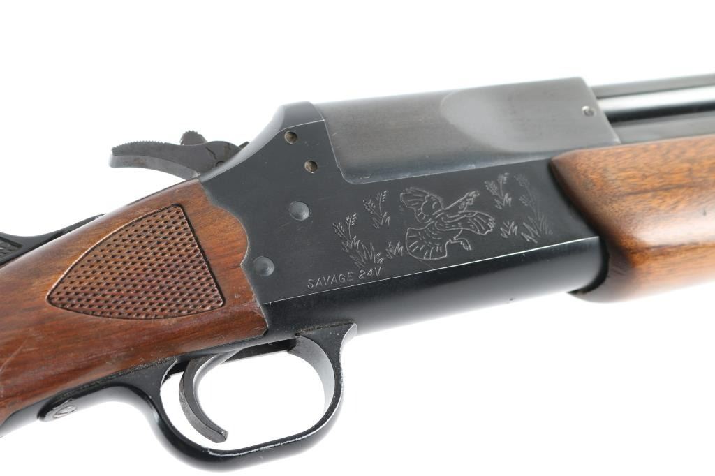 Over/under boxlock combination gun chambered for .222 Remington, over 20 gauge (accepts up to 3" shells). Features matte blued finish, 24" separated barrels, shotgun barrel is choked IM, extractors, undercut Partridge front sight, folding adjustable rear sight, exposed hammer with barrel selector & serrated spur, limited game scene scroll engraving on receiver sides (fox & turkey), alloy trigger guard, top lever opening, checkered wood forend, checkered wood semi-pistol grip shoulder stock with grip cap & high comb, serrated plastic buttplate, 14-3/8” LOP. Bores are very good condition, need cleaning. Retains approximately 90% original finish showing edge losses & handling marks. Stock & forend are very good condition with dings & blemishes to finish. Includes ammo - approx 50 rds 20ga #6 shot, approx 30rds 222 in vintage boxes (partial boxes). Condition is near NRA Excellent *** Modern Firearm ***