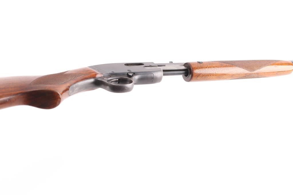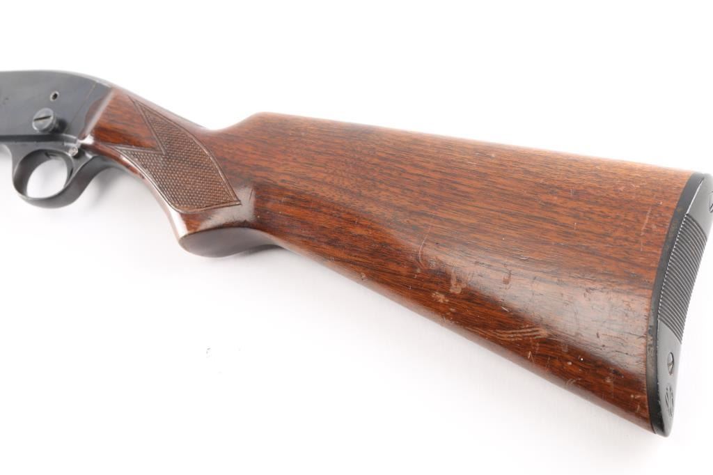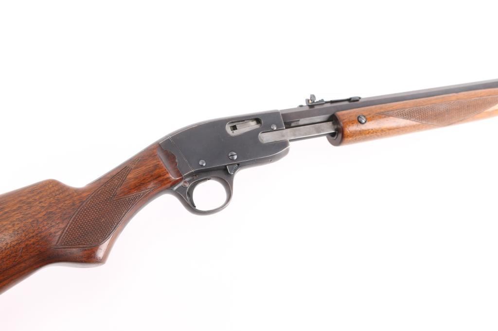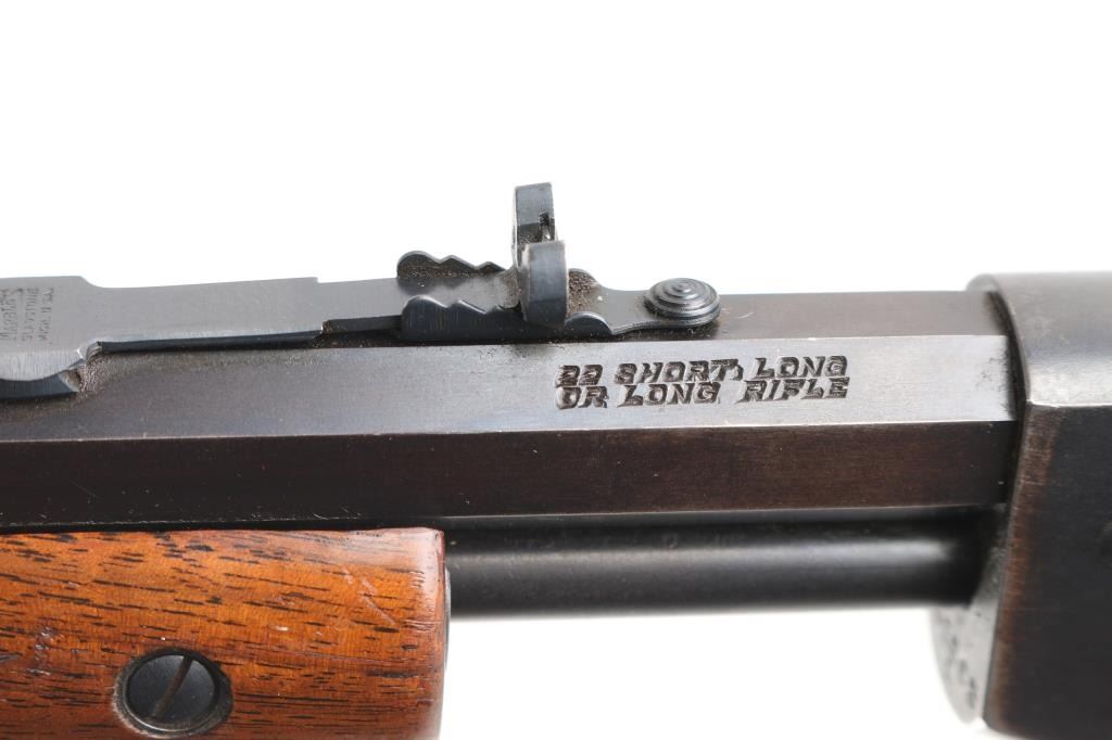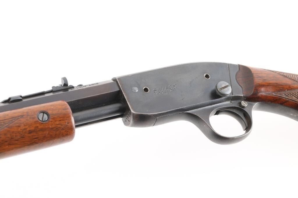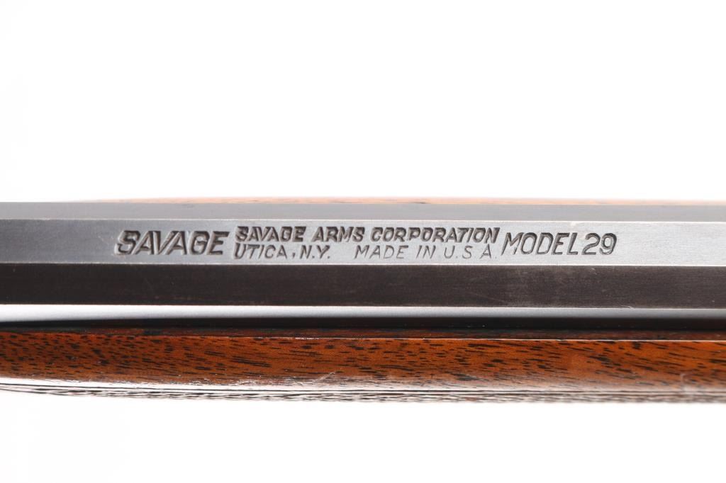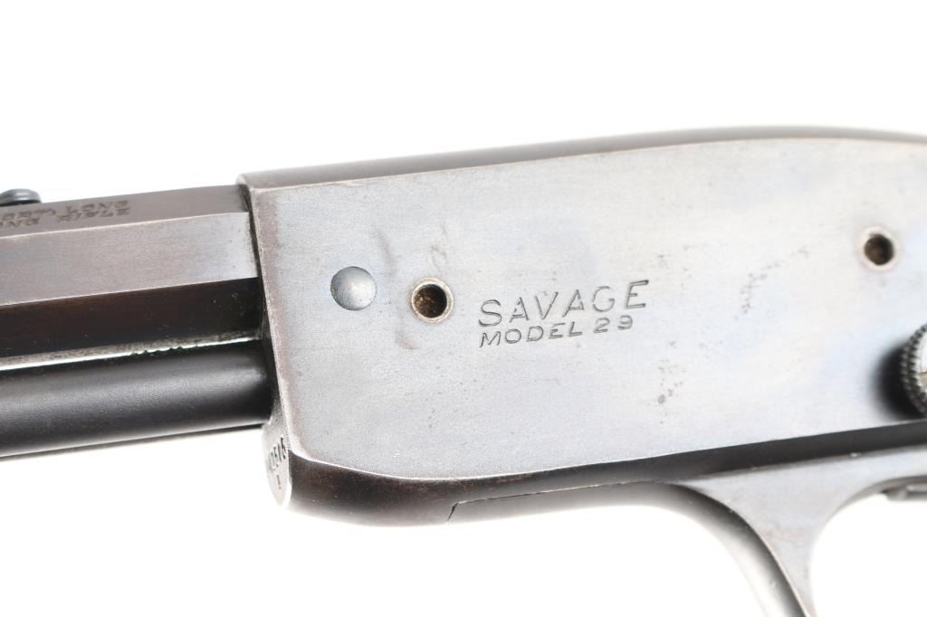Pump action rifle features approx 24 inch octagonal barrel, tube magazine, blade/bead front and Marbles adjustable notch rear sights. Tang drilled/tapped for peep sight, right receiver drilled/tapped for optics/sight.(No filler screws) Bore is very good/bright. Blue finish is about 75% with handling wear mostly on the bottom metal, minor scratches and edge wear. Stock and pump handle are very good condition with minor scratches. Buttplate is very good, marked "Savage. The model 29 was replaced with the Model 29-A about 1938Condition is NRA Good. C&R Firearm.