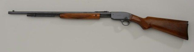 Savage Model 29-A pump action rifle, .22 short, long and LR cal., 24” round barrel, blue finish, checkered wood stocks, #NVSN. This rifle is in overall fine condition showing approx. 98% original finish, finebore, crisp action and markings, fine wood. Est.: $150-$300.