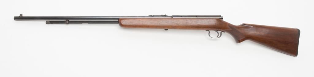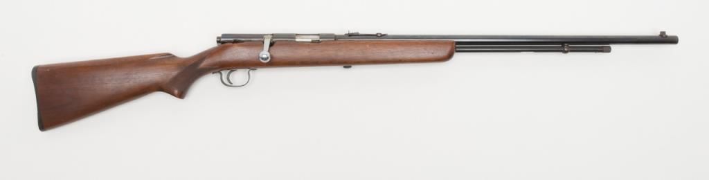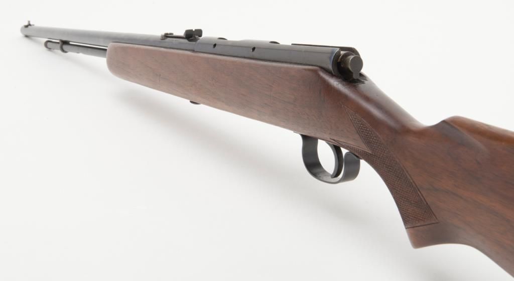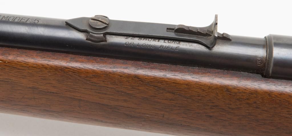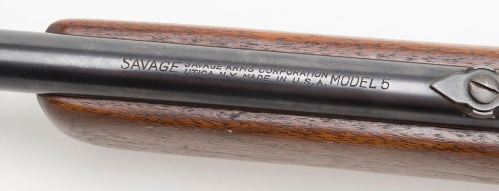 Savage Model 5 bolt action rifle, .22 Short, Long or Long Rifle caliber, Serial #NSNV. The rifle is in overall fine condition with a 24” blued barrel. The rifle retains the majority of its blued finish, with a crisp action and sharpmarkings. The bore is very good and may clean. The checkered wood stocks are in very good condition as well with small marks consistent with storage. The action is drilled and tapped for a side mount scope. (C+R/PPT). Est. $200-$400.