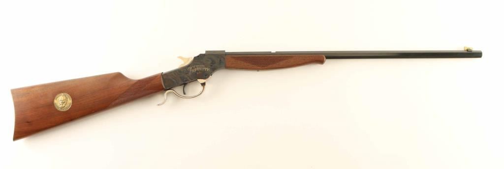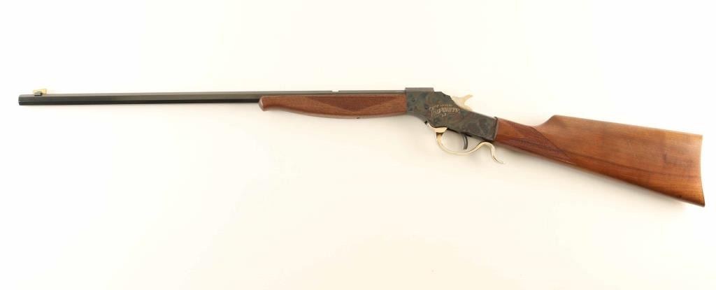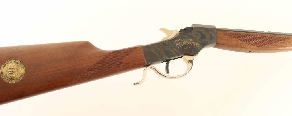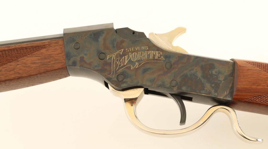 SN: 09452SF 'Stevens Favorite' Commemorative falling block single shot sporting rifle celebration the "Father of 22 Hunting", Joshua Stevens. Number 9,452 of only 20,000 produced circa 1971. Features a blued 22" octagonal barrel which has been drilled & tapped for a scope, dovetailed front sight with brass blade, removed rear sight, case hardened receiver engraved "STEVENS FAVORITE" on both sides, smooth trigger with beveled edges, brass plated hammer & finger lever, checkered wood forend and straight grip shoulder stock with smooth metal buttplate & inlayed commemorative coin in the right side of the butt. Rifle exhibits approximately 93% of it's original blued & case hardened finish showing light edge wear, a couple blemishes & some faded case colors. Action is sound, the bore is excellent and the wood stocks are fine. Condition is NRA Very Good++. ***Modern Firearm***