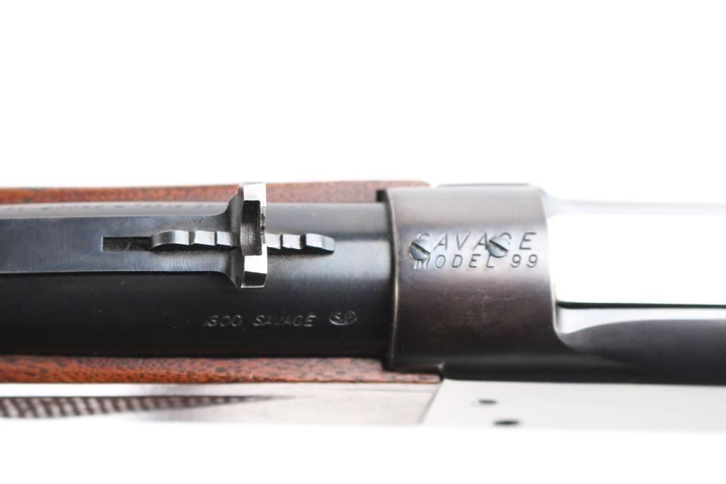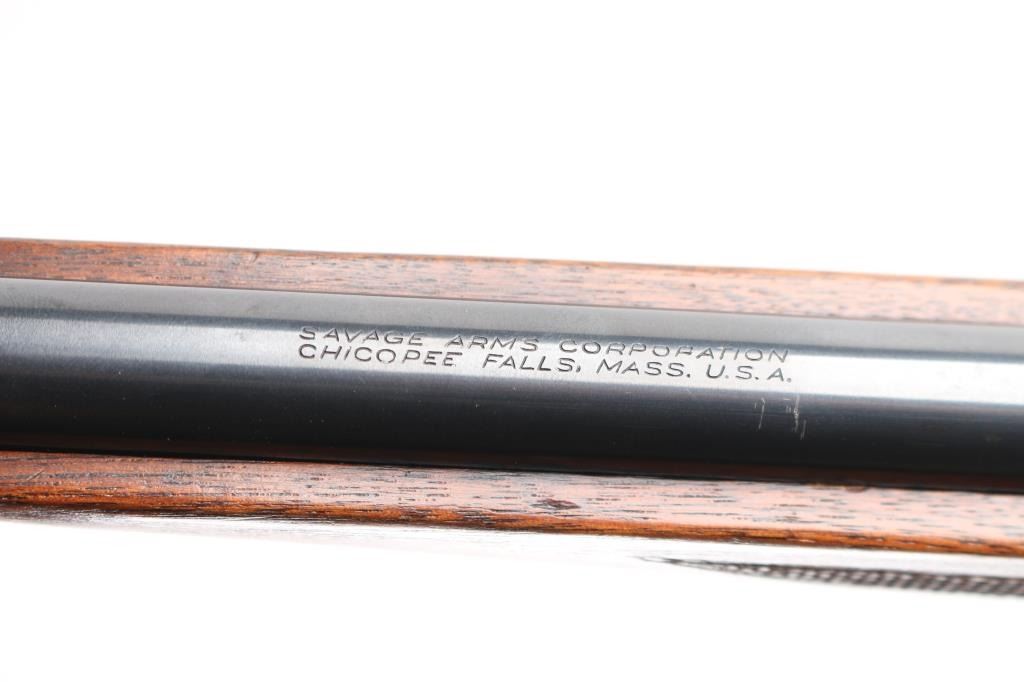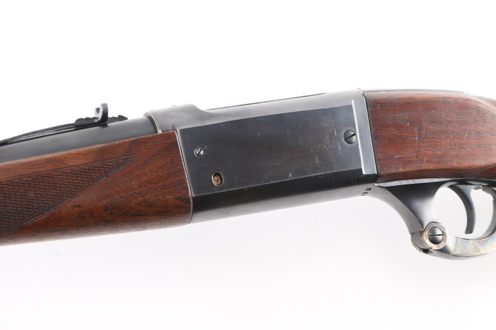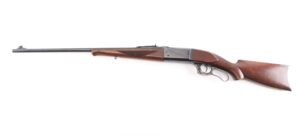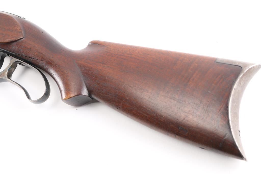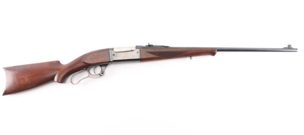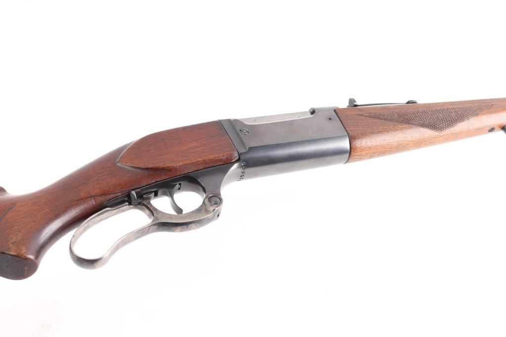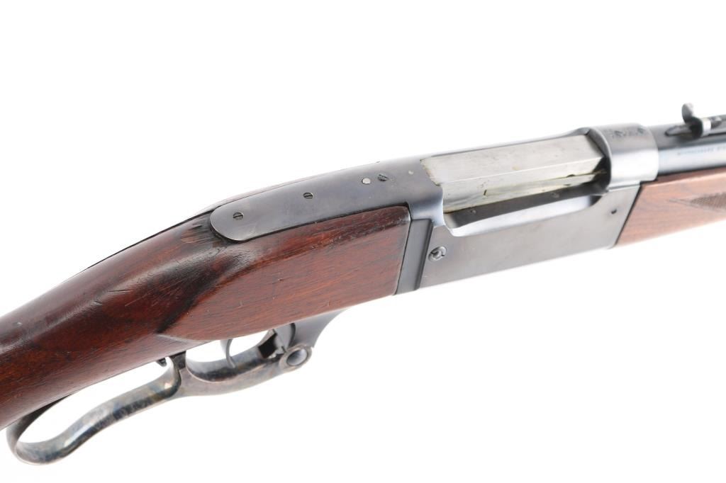 Lever action rifle manufactured circa 1951. Features blued finish, checkered walnut forend & curved wrist shoulder stock, crescent steel buttplate, 24" tapered barrel, raised bead/blade front sight, semi buckhorn adjustable rear sight, fixed rotary magazine with brass cartridge counter, lever lock, cocking indicator. Bore is excellent/bright condition. Retains 94% finish, with handling marks, edge losses & small scratches on receiver. Bolt has bright surface. Case hardened colors on lever are mostly there. Wood has a chip behind the upper tang, a 2" hairline crack on the right wrist above the lever, and a 5" hairline crack from the tang into the left wrist, forearm is very good condition. Action is smooth. Provisions for sling swivel studs.