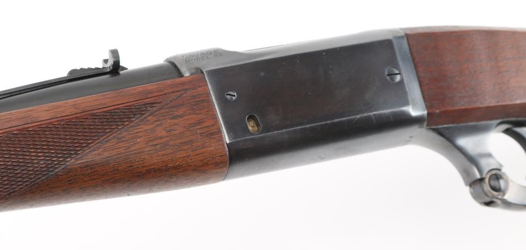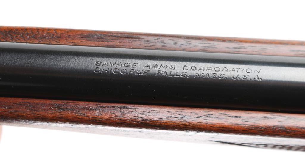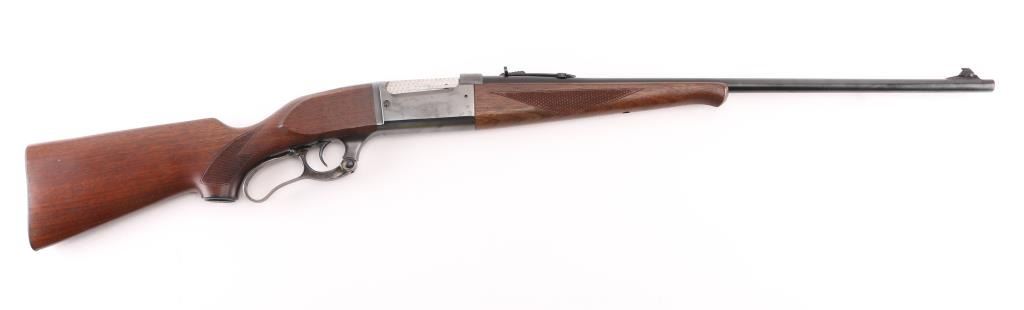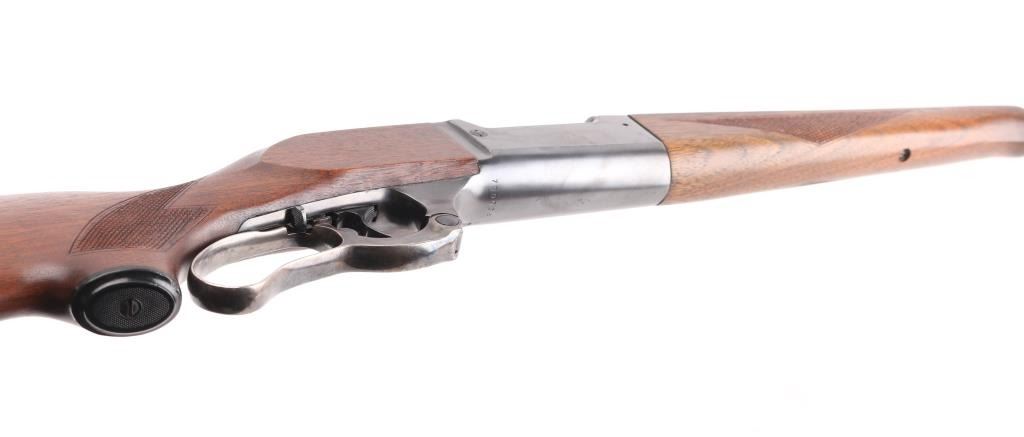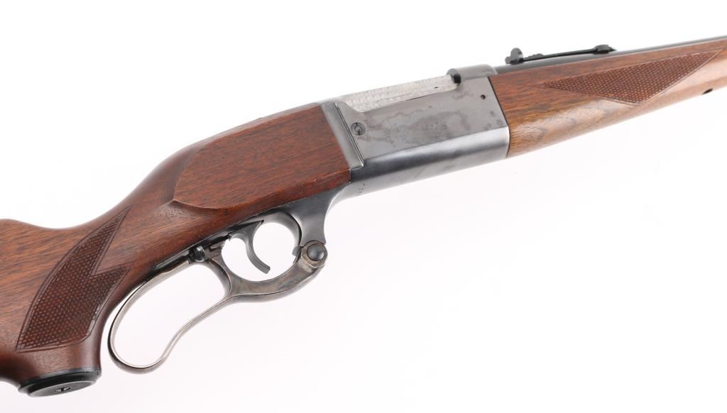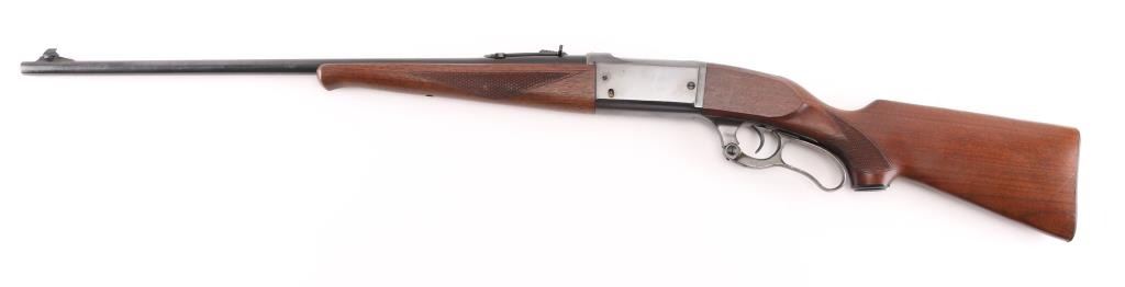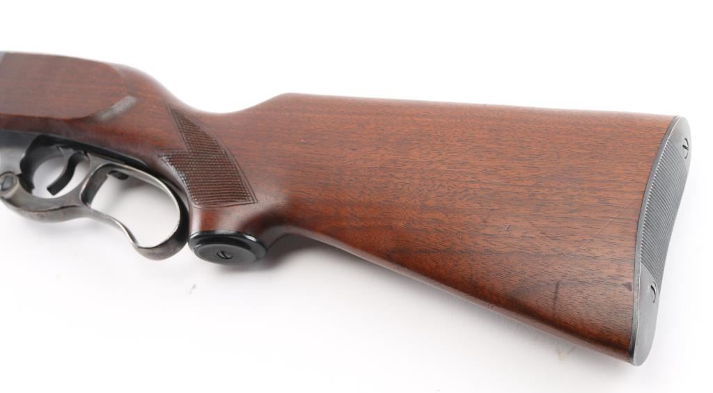 Restored vintage lever action rifle manufactured circa 1955. Barrel marked with Chicopee Falls, Mass address. Features reblued finish, case color finger lever, serrated trigger, two piece wood stock with curved grip, checkered panels at wrist & schnabel forend, serrated steel butt plate, 24" barrel, post/bead front sight, rear sporting sight, fixed rotary magazine with brass cartridge counter, tang safety also locks lever, cocking indicator. Machine turned 'jeweled' bolt. Bore is excellent/bright. Retains 98% reblue, with minor edge wear/scratches. Finger lever retains golden and some blue hues to the case color. Wood is very good with very minor scratches. Wood is near excellent with minor scratches/dings. NRA Condition-Excellent as Restored. C&R Firearm.