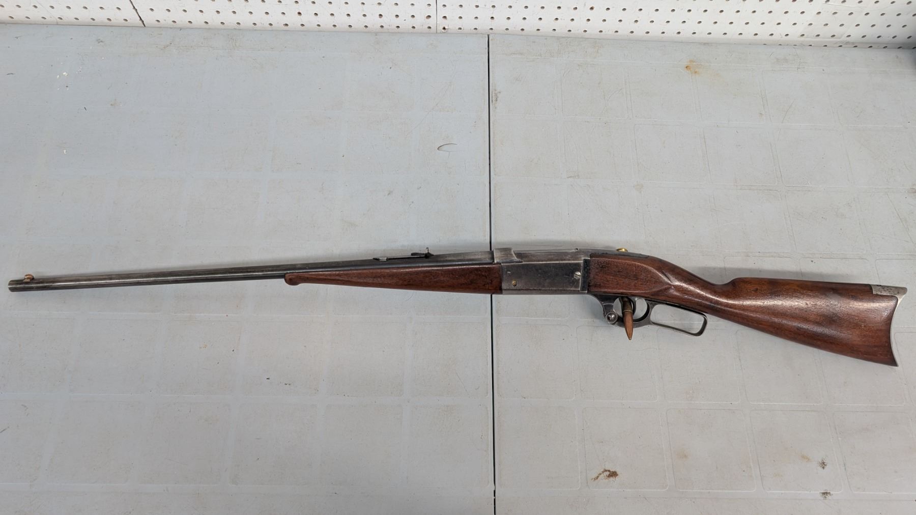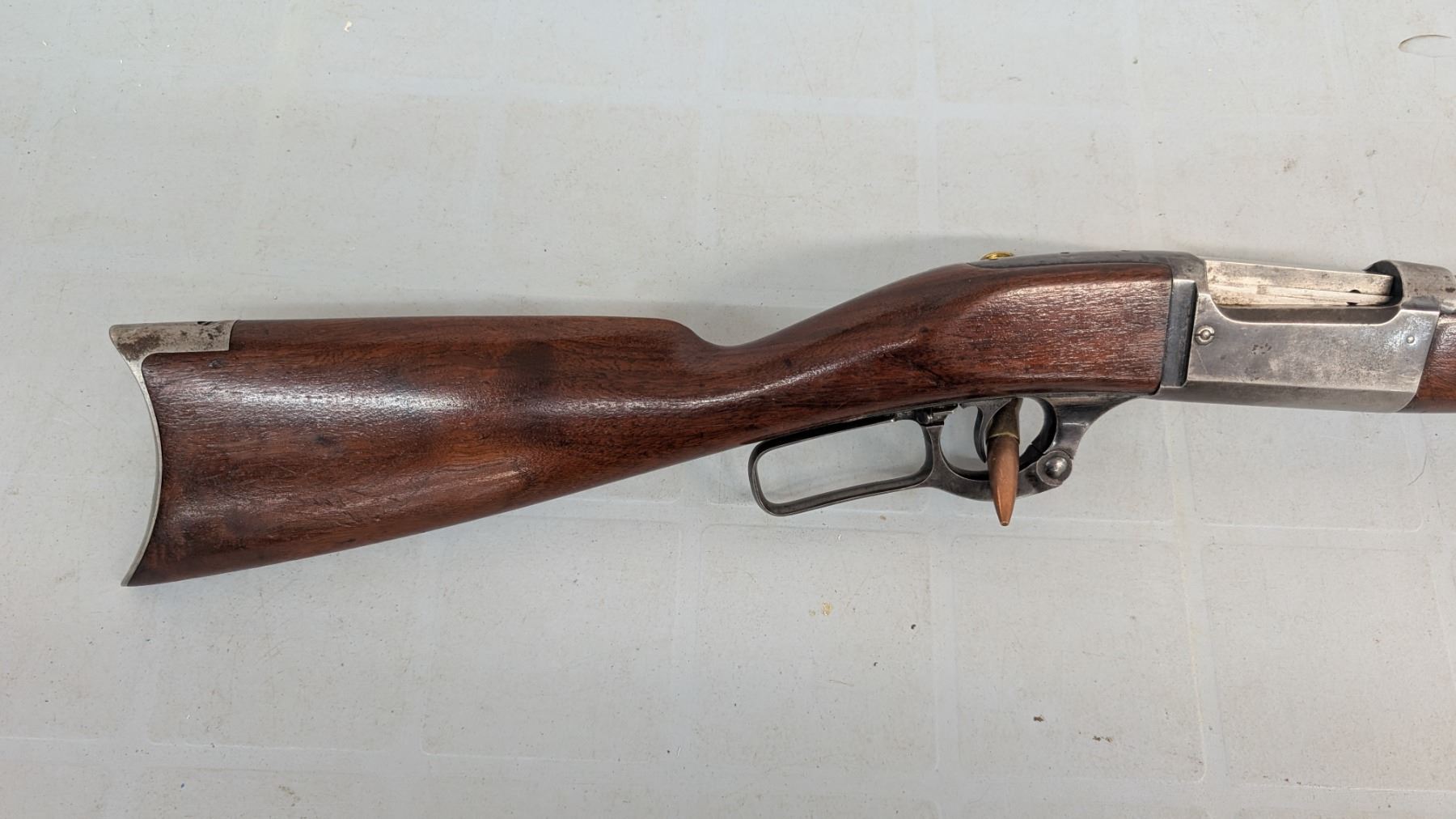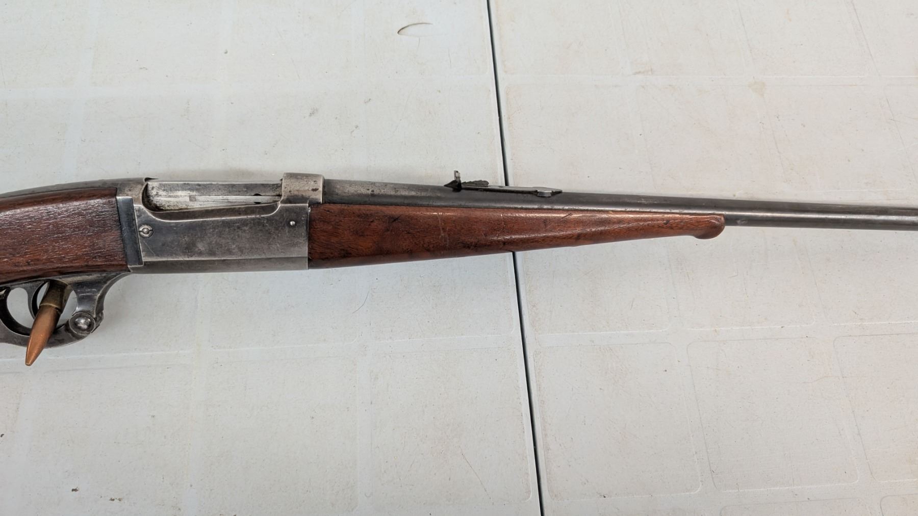 Lever action. Bore is shiny with lots of rifling. lots of blue still present in protected areas. Trigger tang safety model brass rotary magazine. 26" barrel. Stocks are in excellent condition.