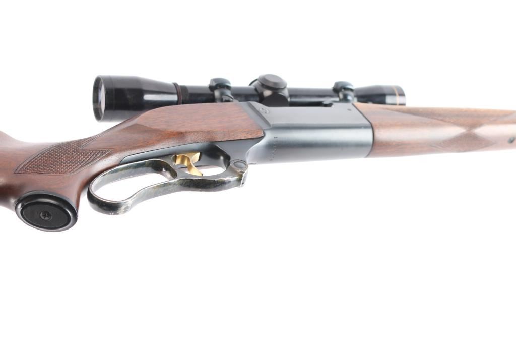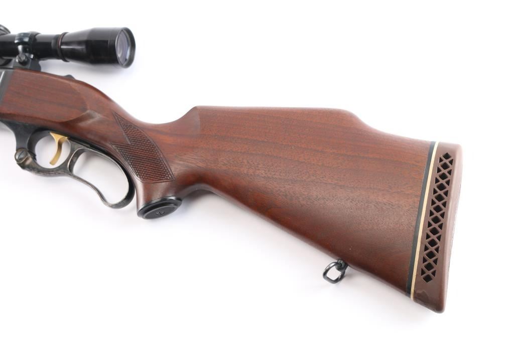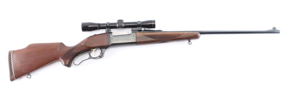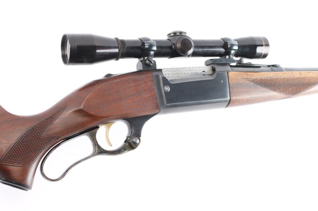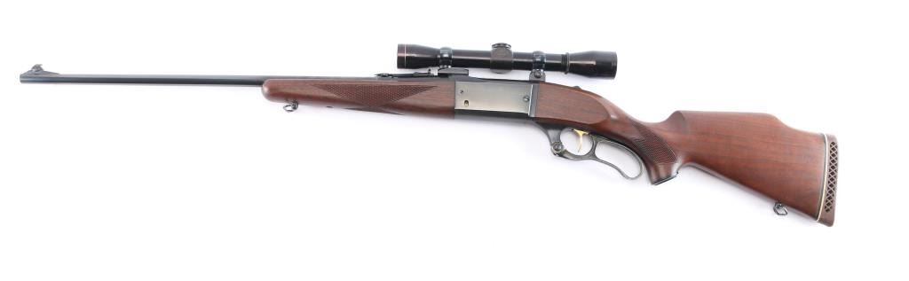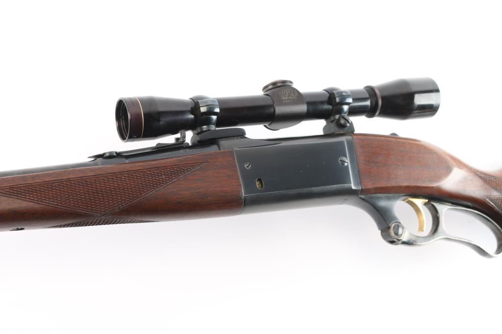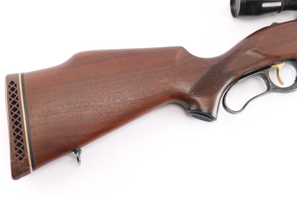 Lever action rifle manufactured circa 1960 chambered in .308 Winchester. Features blued finish, case colored lever, checkered walnut forend & curved wrist shoulder stock, high comb, vented rubber recoil pad, black grip cap. 24" tapered barrel, raised blade/bead front sight, sporting rear sight, sling swivels, fixed rotary magazine with brass cartridge counter, gold toned serrated trigger, sliding tang safety, cocking indicator, jeweled bolt. Bore is excellent/bright, strong rifling. Retains about 96% finish, with slight handling/edge wear, some wear to the case color on the lever. Stocks are excellent/sound with a little finish loss from handling on the top of the left forearm. Mounted with a Leupold M8-4X scope, clear optics, fine cross hair reticle.
