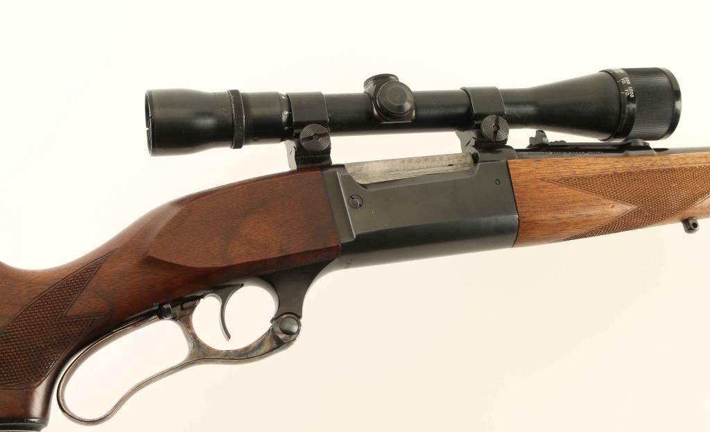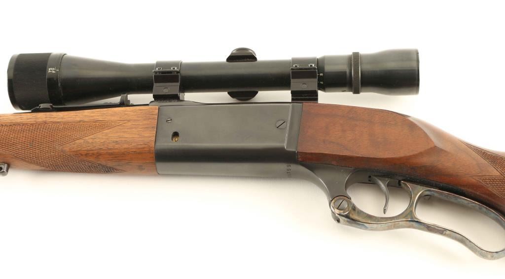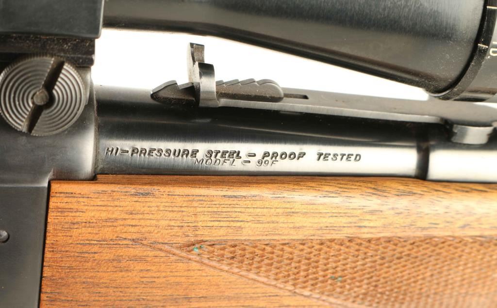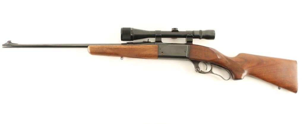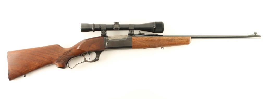 Vintage lever action repeating rifle chambered in .300 Savage, manufactured circa 1955. Features a blued finish, 22" tapered barrel, ramped blade front sight with bead top, elevation adjustable semi-buckhorn rear sporting sight, installed Weaver V9 3-9x scope, internal rotary magazine with brass spool/round counter, jeweled bolt, cocked indicator on the upper tang, serrated trigger, case hardened curved finger lever, sliding safety on the lower tang, swivel studs, checkered walnut forend and pistol grip shoulder stock with plastic grip cap & serrated metal buttplate. Rifle exhibits approximately 97% of it's original blued finish showing showing a few scattered handling marks and vivid case colors. Action is smooth, the bore is excellent and the wood stocks are near fine with minor blemishes. Condition is NRA Excellent. ***C&R Firearm***