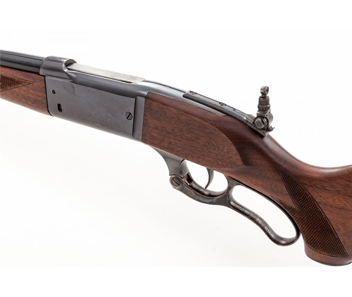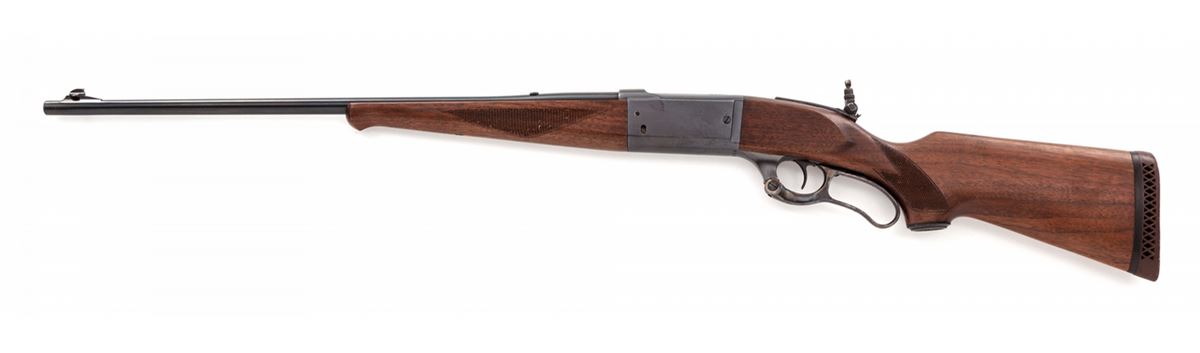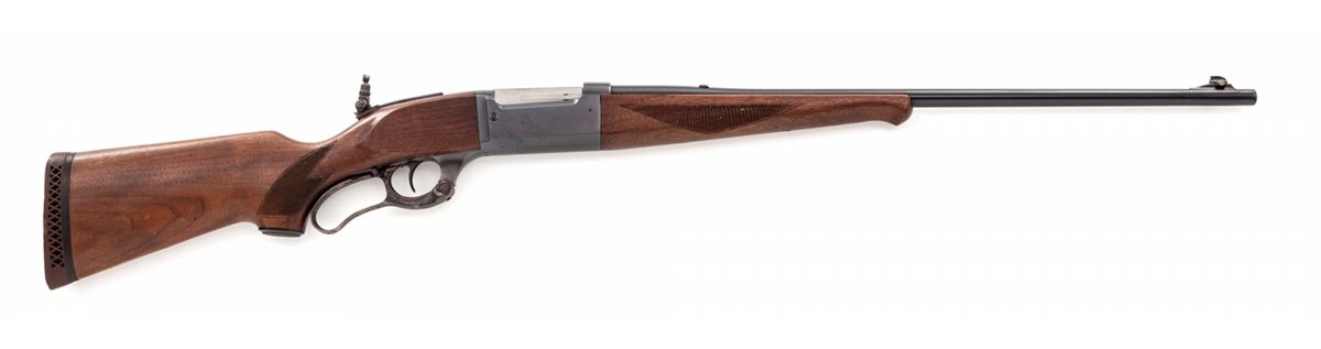 Savage Model 99 Lever Action Rifle, #642659, .300 Sav. cal., 24'' barrel, blue finish, case hardened lever, checkered walnut stock, with brass bead front and Marbles peep sight, and early Pachmayr red rubber butt pad. Condition is fine to near excellent showing very minor discoloration to flat sides of receiver and case hardened lever. Stock with light impressions from handling. Action is good, bore is fine. Est.: $500-$750. (C&R)
