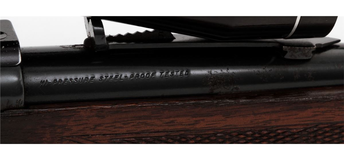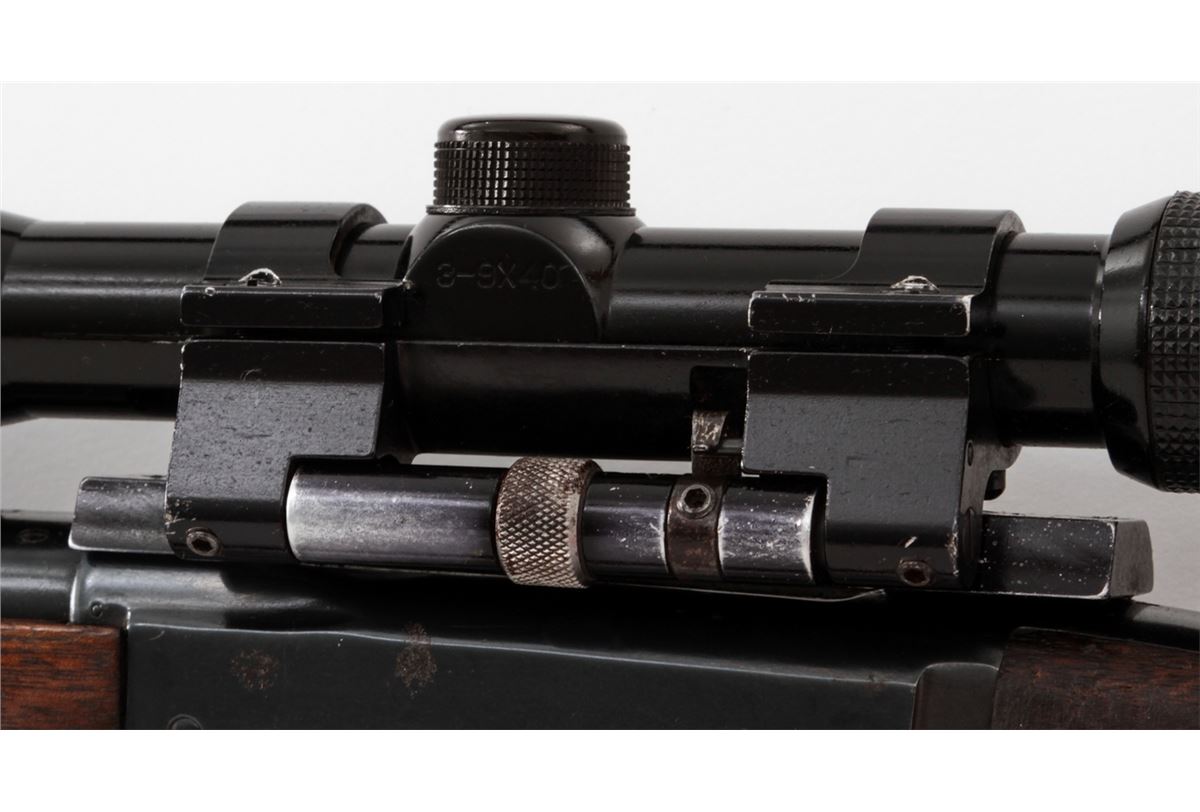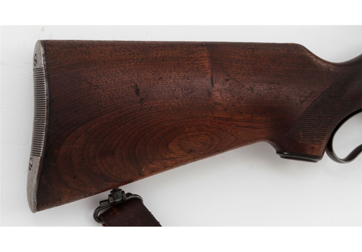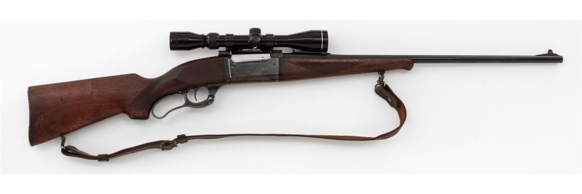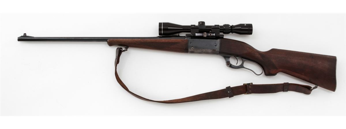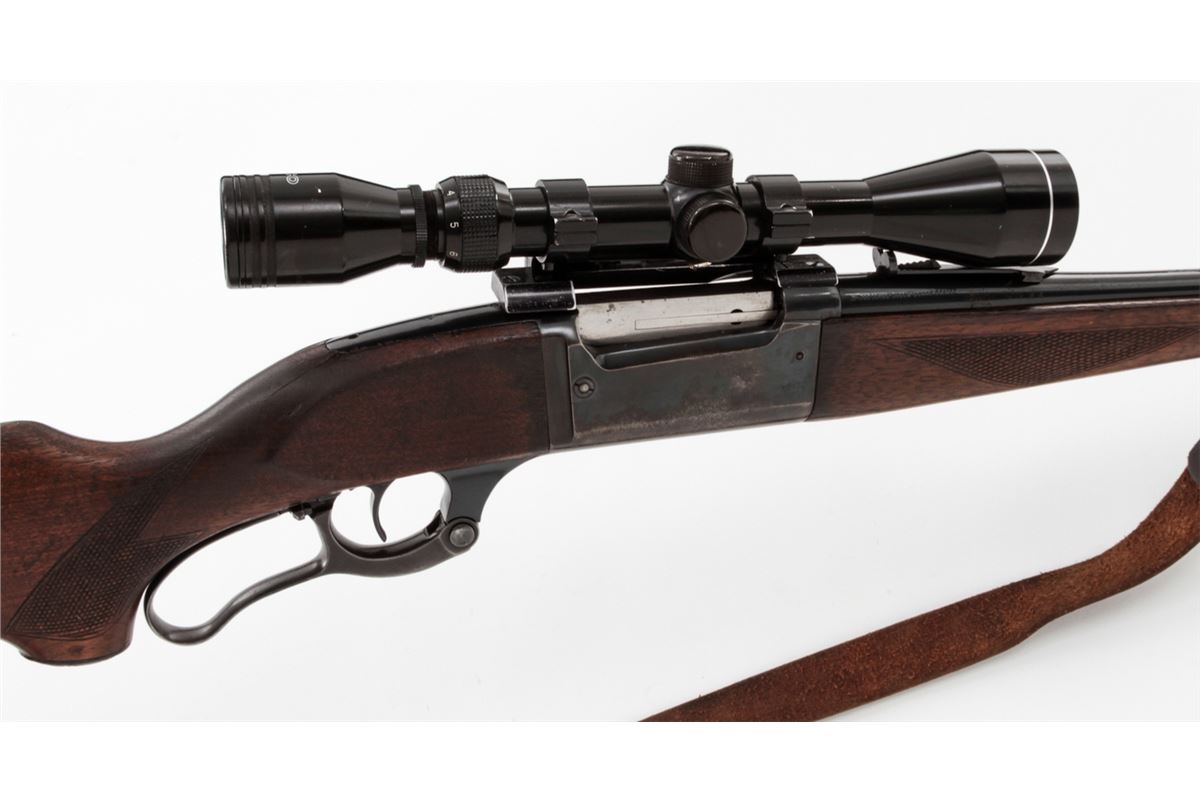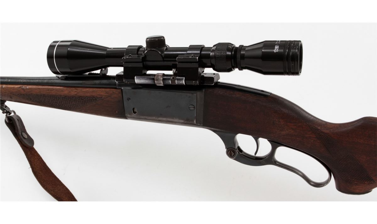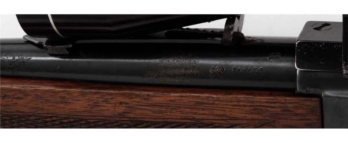 Savage Model 99 Lever Action Rifle, #705464, .300 Sav. cal., 24'' barrel, blue finish, checkered walnut stock, with one commercial sling. Topped with a Tasco 3-9x40 scope on Pachmayr tip-off mounts. Condition is good as refinished retaining approx. 85% blue with pitting to top of barrel and thinning at balance point. Light to moderate scuffs and scratches to stock with some oil darkening. Lever pivot screw is a later replacement. Good action and bore, scope optics are clear. Est.: $300-$400. (C&R)