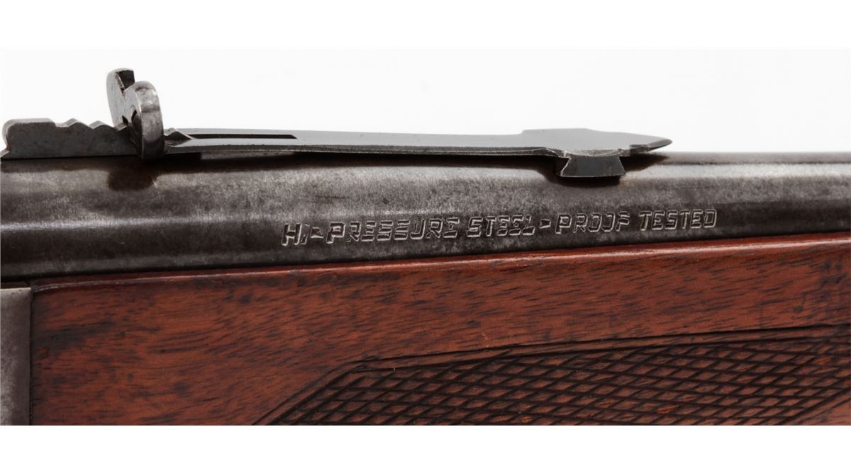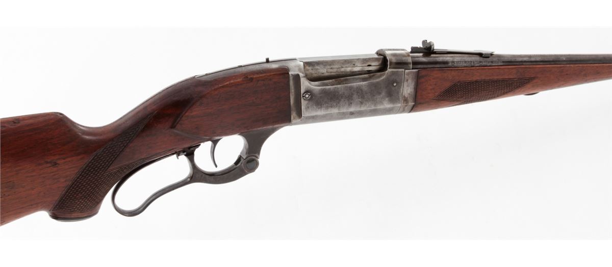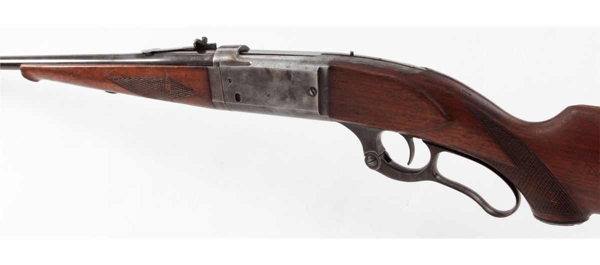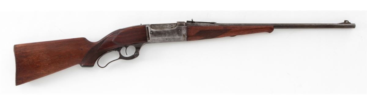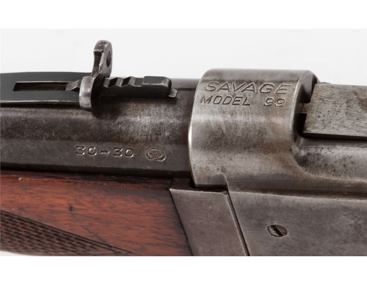 Savage Model 99 Lever Action Takedown Rifle, #320350, .30-30 cal., 22'' barrel, blue finish, factory checkered walnut stock, with steel buttplate. Cocking indicator and cartridge counter are present. Standard rear and nickel silver front sights. Condition is very good retaining approx. 75% blue to barrel; frame about 20%; case colored lever shows approx. 80%. Stock with moderate scuffs, scratches, and flattening to checkers from field use. Action is good, bore is fine. Est.: $350-$500. (C&R)