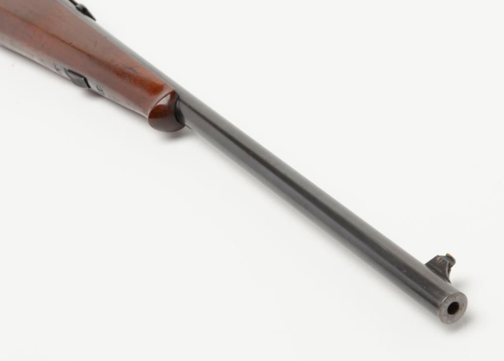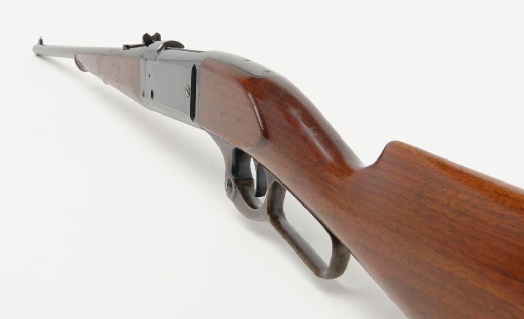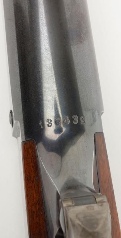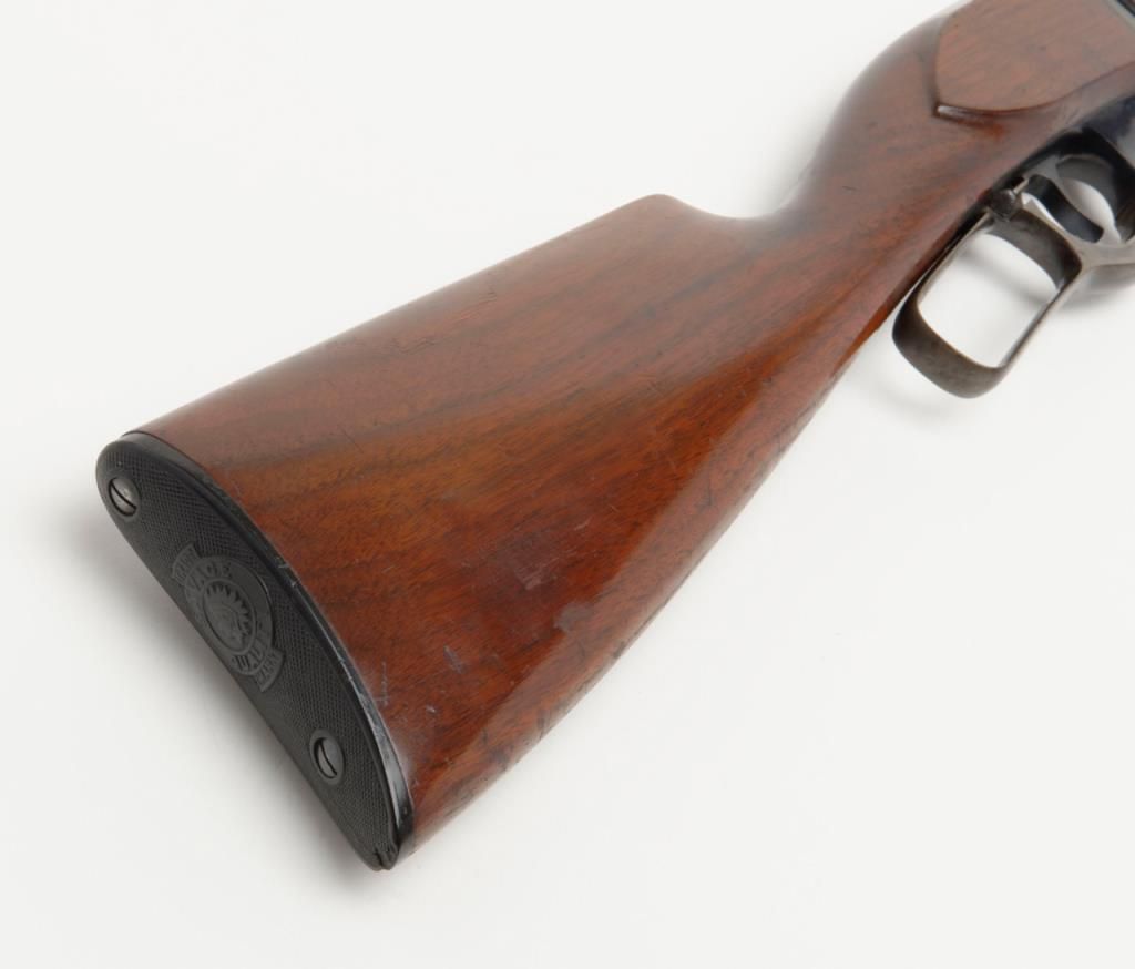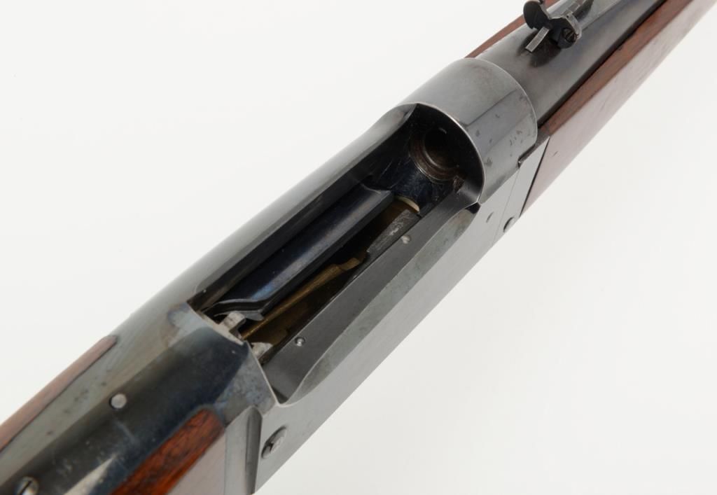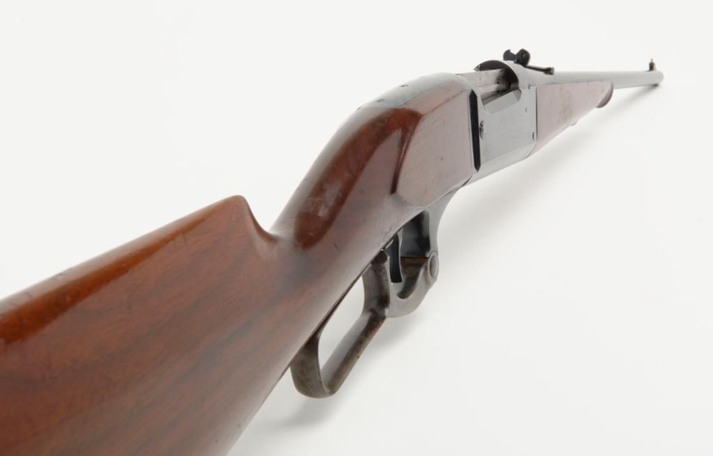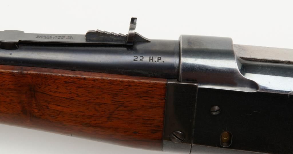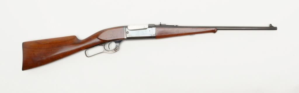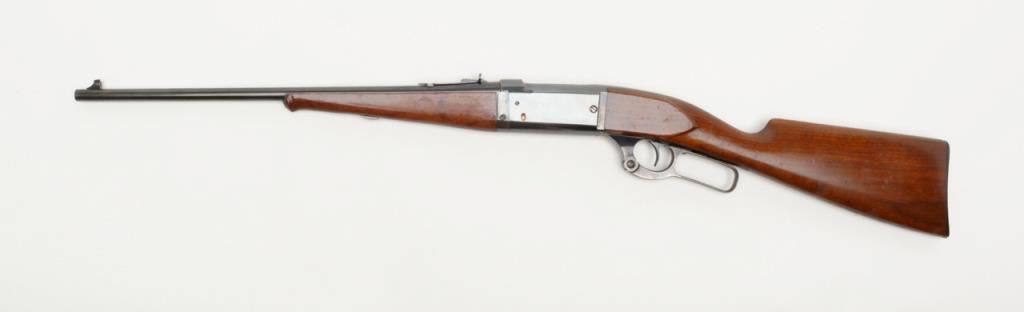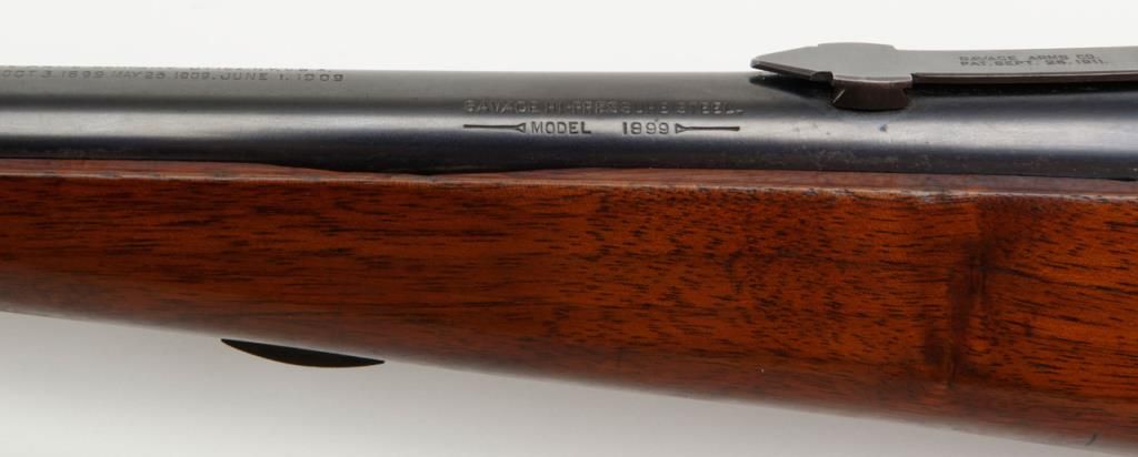 Savage Model 99 Take Down lever action rifle, cal. .22 HP, Serial #130439. The rifle is in overall fine condition with a 20” blued barrel. The rifle retains approximately 85% barrel blue with some slight surface erosion near the muzzle. Theaction retains approximately 75% of its blued finish with thinning along the edges and on the underside of the action, in addition to the original brass cartridge counter. The smooth wood stocks are in overall very good condition withsmall mars and compressions consistent with use, while the lever still shows some case color in the protected areas. The rifle retains the original Savage marked, hard rubber butt plate with Indian Head logo. The bore is very good, the actioncrisp and markings sharp. A fine Model 99 that has seen little use. (C+R/PPT). Est.: $1,500-$3,000.