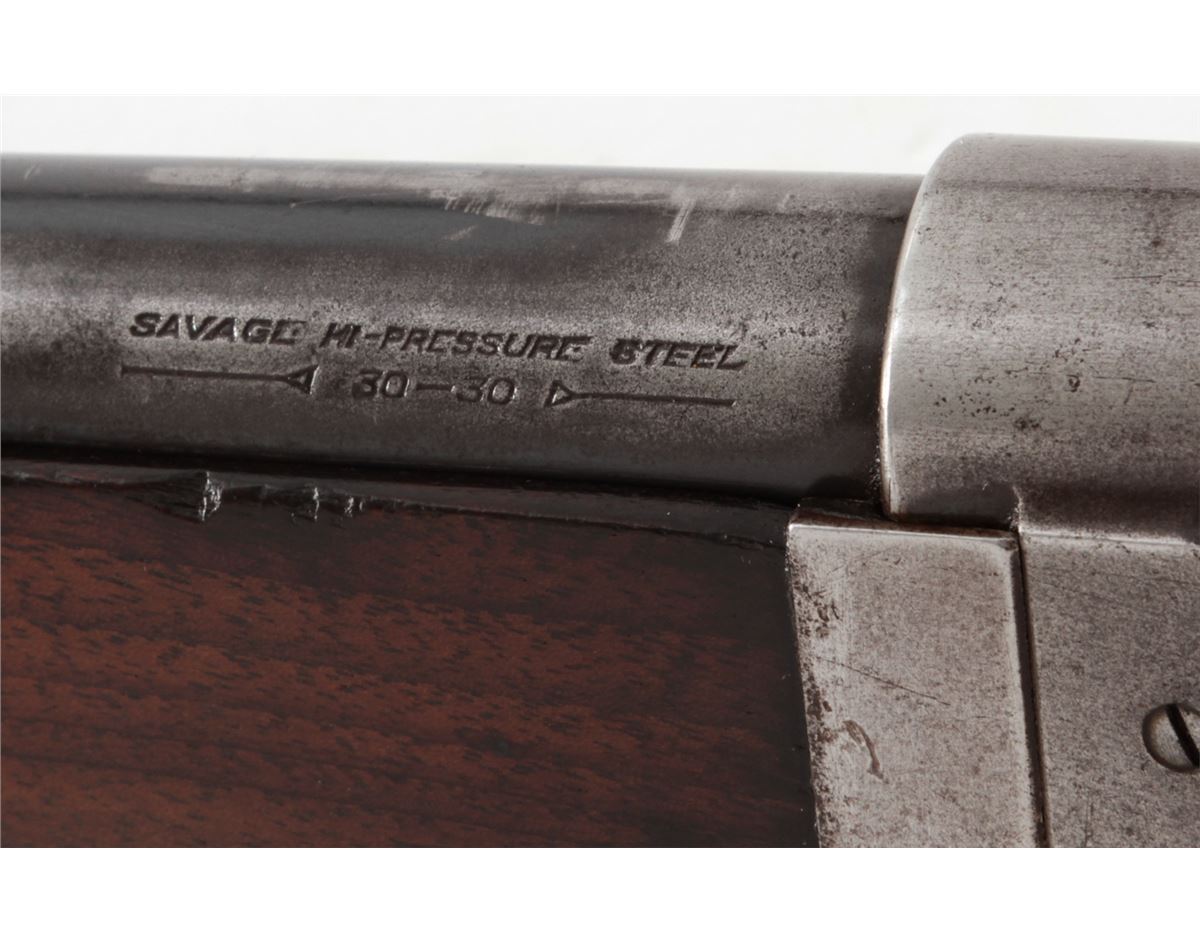 Savage Model 99 Takedown Lever Action Rifle, #231630, .30-30 cal., 26'' barrel, blue finish, walnut stock and forend, with Marbles peep tang sight, brass bead front sight, and dovetail blank to standard rear sight position. Condition is very good retaining approx. 40% thinning and toning blue. Stock with repairs in several places to wrist area. Action is good, bore is very good with light frosting in grooves. Est.: $250-$450. (C&R)