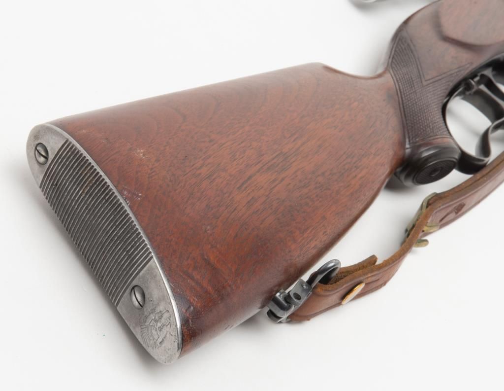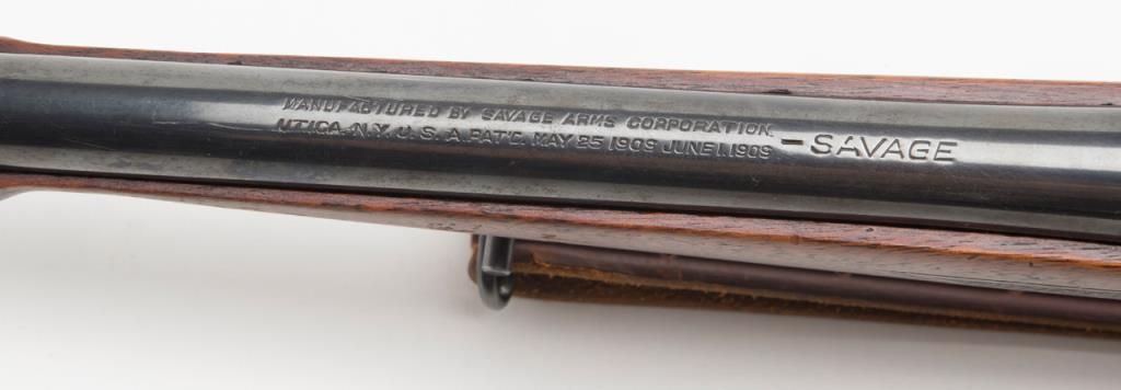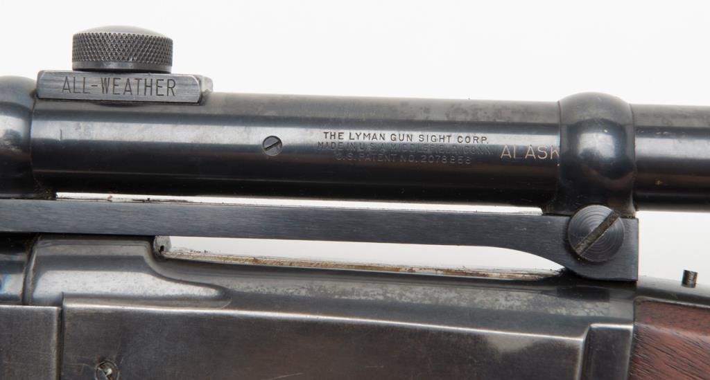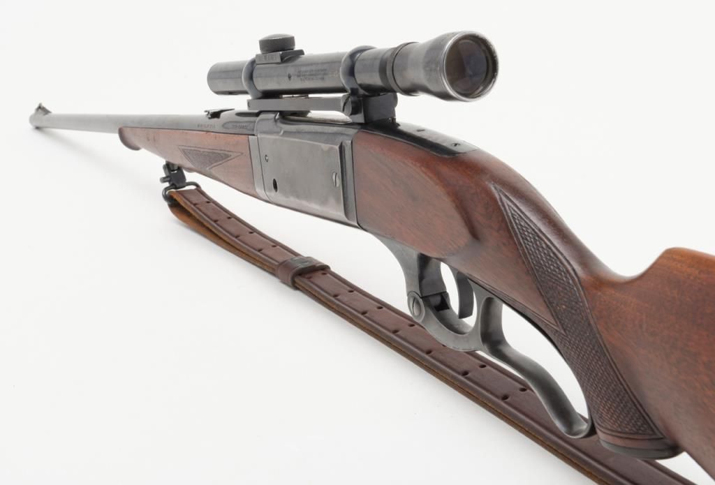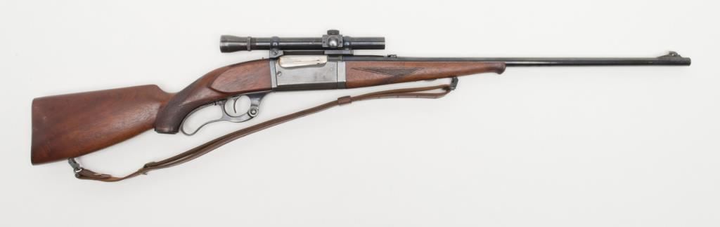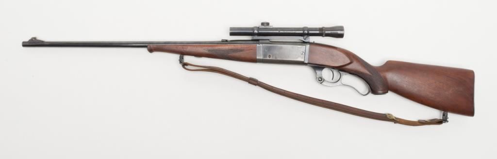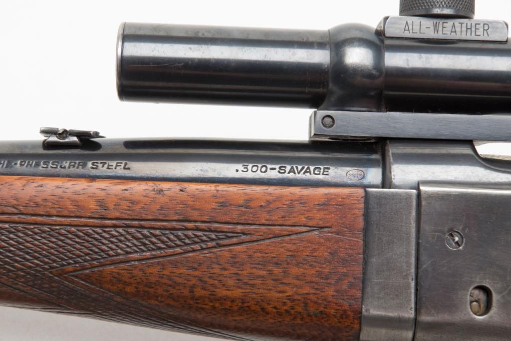 Savage Model 99 lever action rifle, .300 Savage cal., 24” round barrel, blue finish, checkered wood stocks, leather sling, mounted with a Lyman Alaskan scope displaying fine optics, #310728 in overall good condition showing an old re-finish to the barrel, very good bore, action and markings, very good wood. (C&R/PPT). Est.: $300-$500.