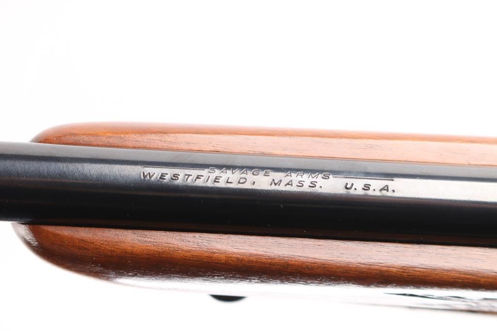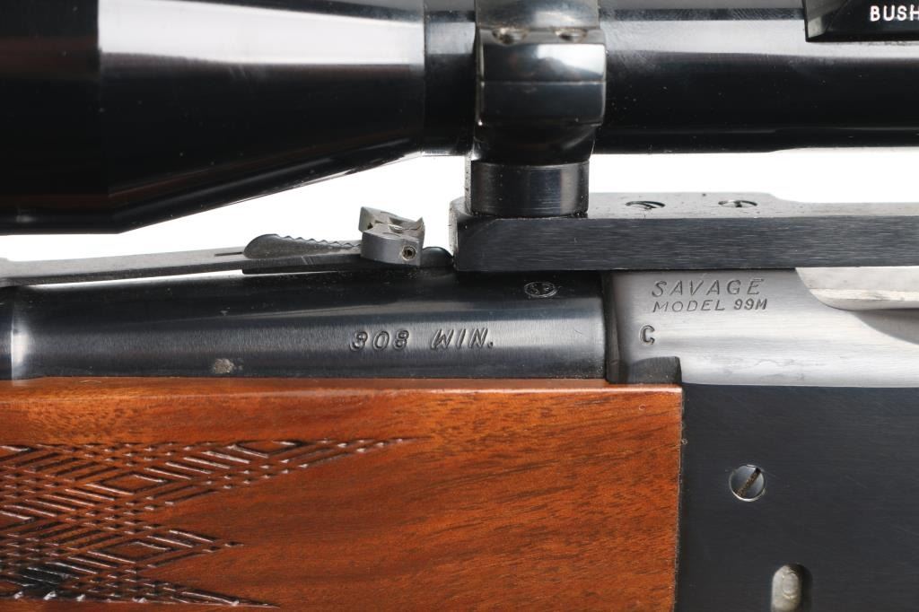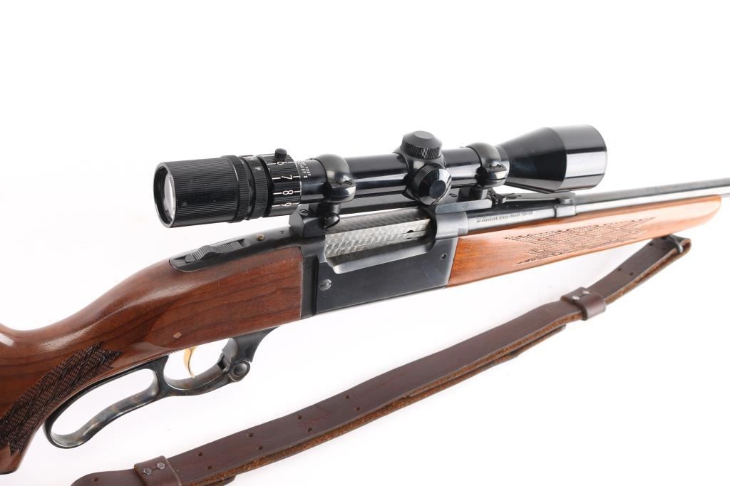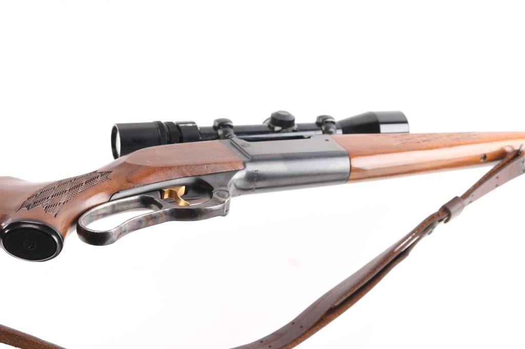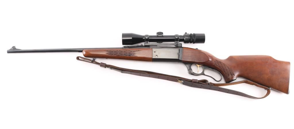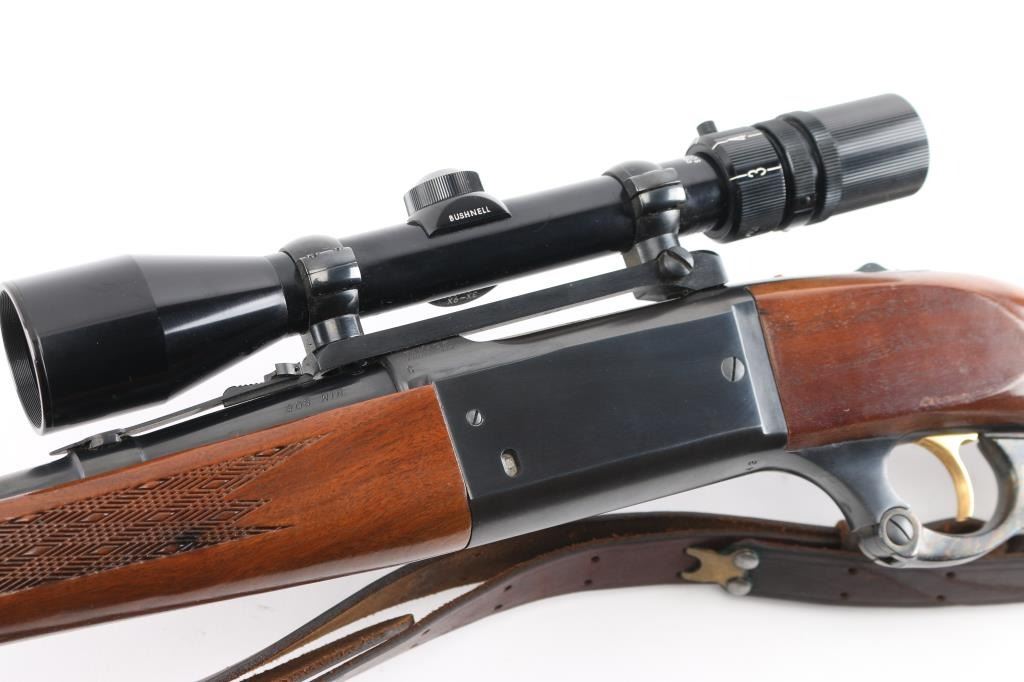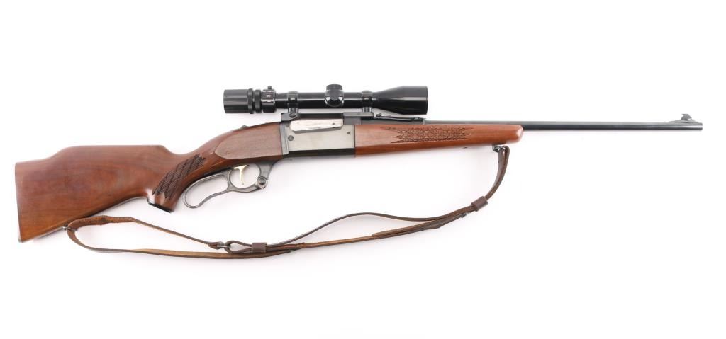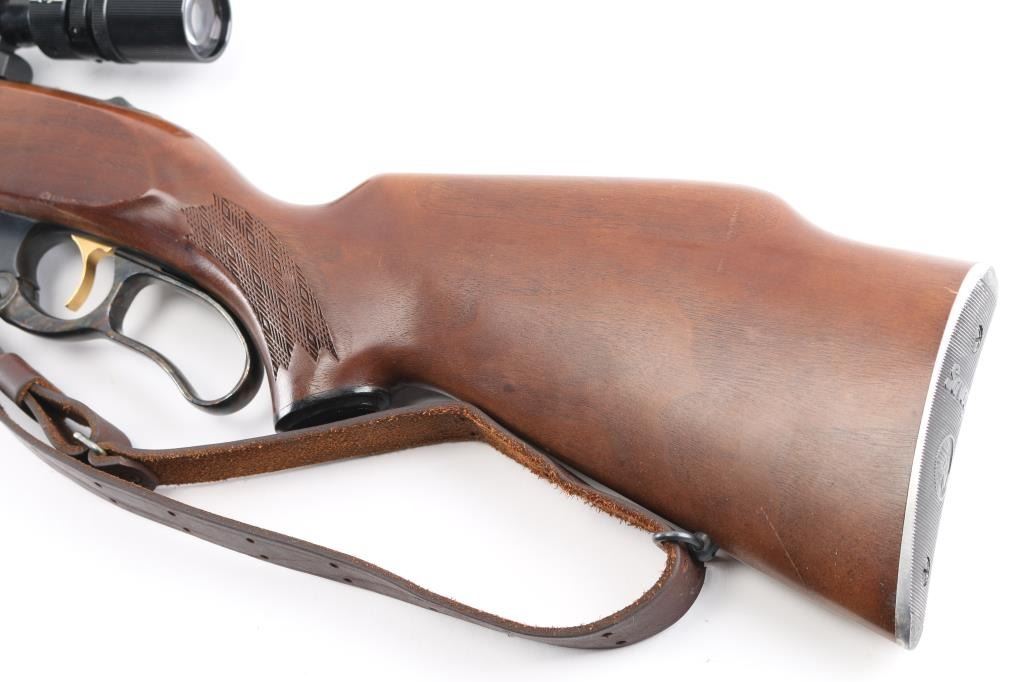 Lever action rifle manufactured circa 1965. Features blued finish, checkered walnut forend & curved wrist shoulder stock, high comb, serrated steel factory buttplate, 22" tapered barrel, blade/bead front sight, adjustable rear flip sight, fixed rotary magazine with brass cartridge counter, tang safety, cocking indicator. Gold toned serrated trigger. Vintage (1965-70) Bushnell Command Piost Scopechief II with one piece Redfield base installed on receiver, fine crosshair reticle. Bore is excellent/bright. Retains 98%. Bolt has bright jeweled surface. Case hardened colors on lever are vibrant. Wood is near excellent with a couple of minor scratches/dings, M1907 style brown leather sling attached.