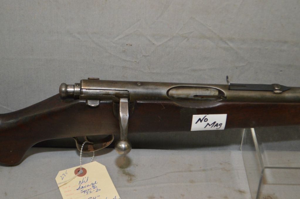 Savage Model Sporter .32 - 20 Cal Mag Fed Bolt Action Rifle w/ 24" bbl [ fading blue finish turning to grey in some areas, barrel sights missing the lift, walnut pistol grip stock w/metal butt plate, missing the mag ] Ser # Nil