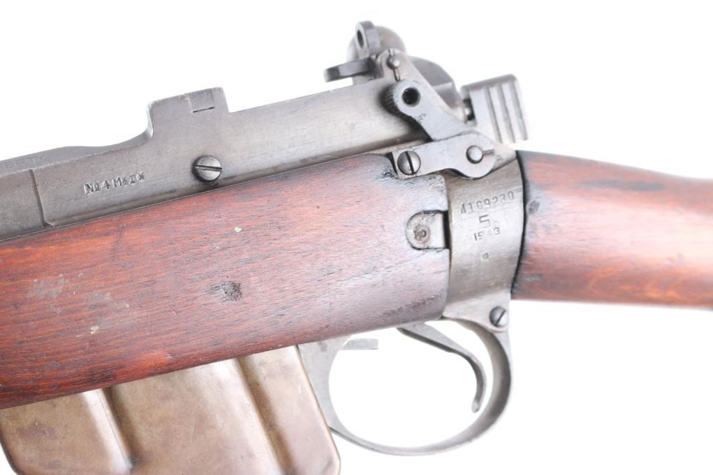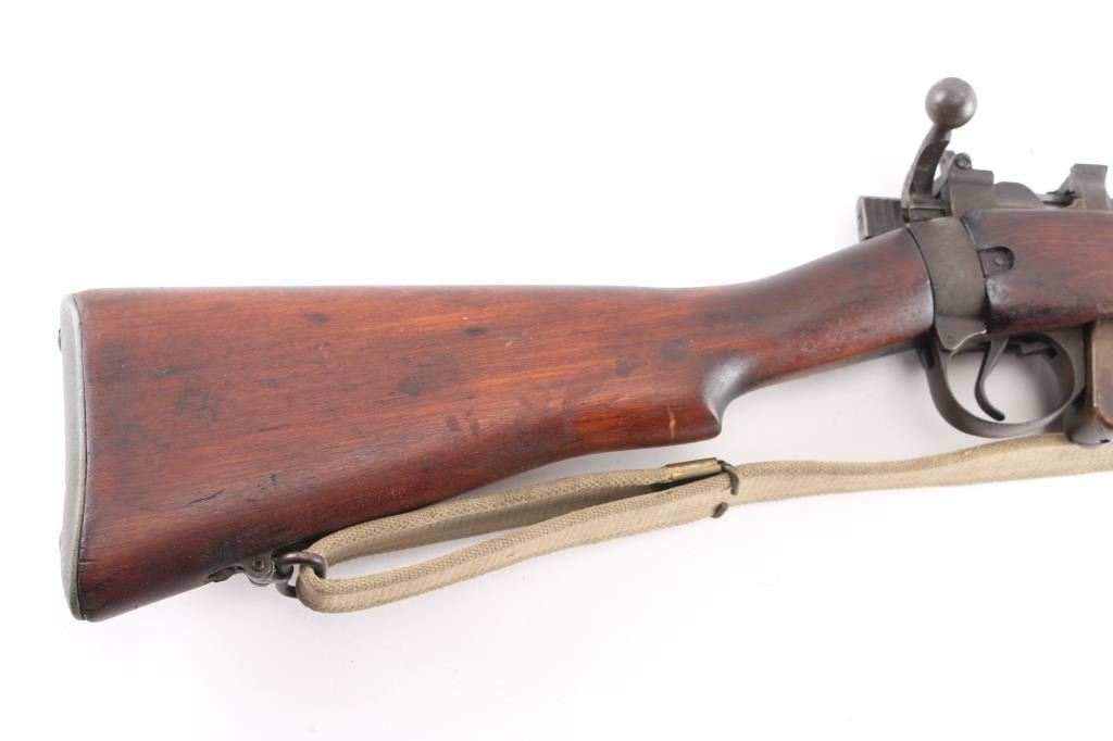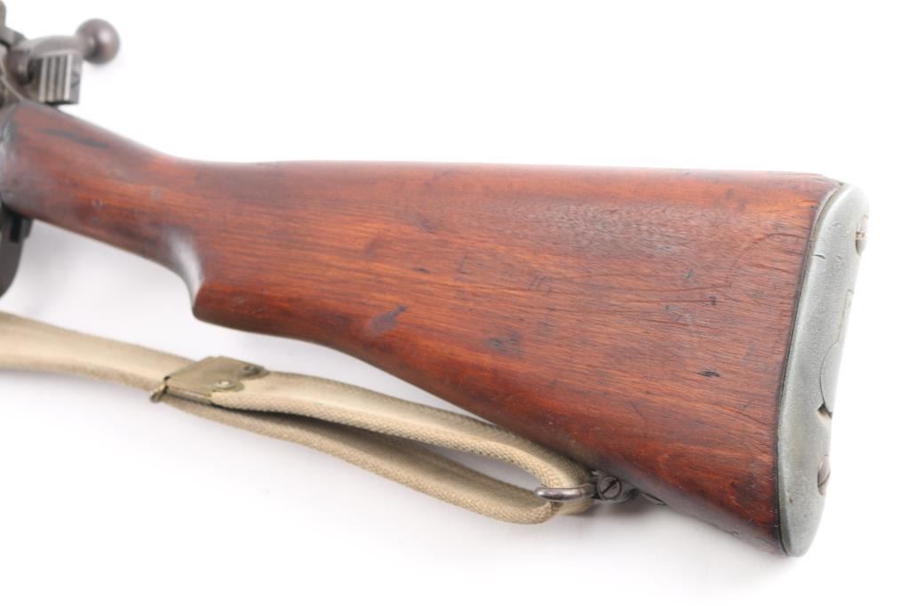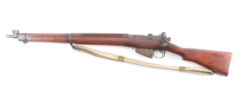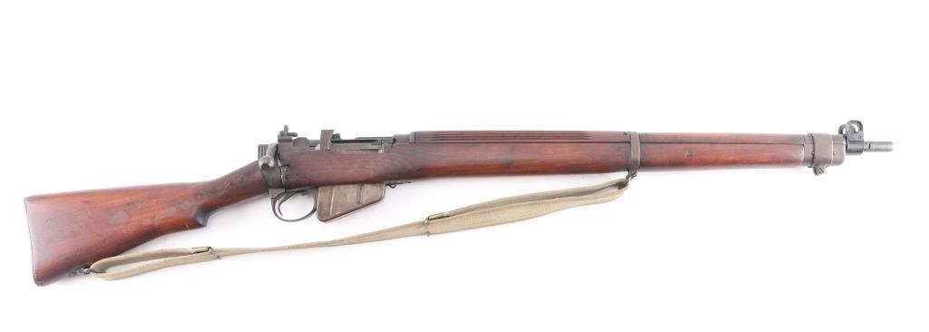 service rifle chambered in .303 British. Produced in the United States by Savage (C in serial number) as a No 4 Mk 1* (Star indicates simplified production in North America) for the war effort via the lend-lease program in 1943. 25.2" barrel with integral bayonet lugs, shrouded patridge front sight, receiver mounted flip-up aperture rear sight graduated to 1,300 yards, two barrel bands, smooth trigger, detachable 10 round magazine, manual safety on the left side of the receiver, integral charge loading guide cuts in the receiver, sling swivels, smooth full-length grooved wood handguard & forend, and straight grip shoulder stock with aluminum trapdoor buttplate. The left side of the receiver is marked "U.S.PROPERTY", “ No4 Mk1* left butt socket stamped with sn over large "S: and "1943", small flaming bomb on bayonet lug, and bolt. Rifle has a gray finish. Action is sound, the bore appears excellent/bright, and the wood stocks are very good/sound. No import marks. Comes with correct canvass sling.