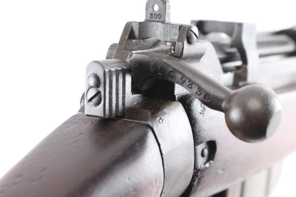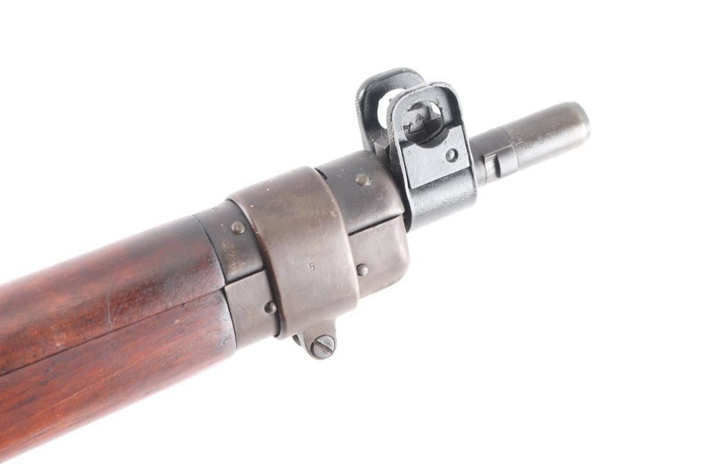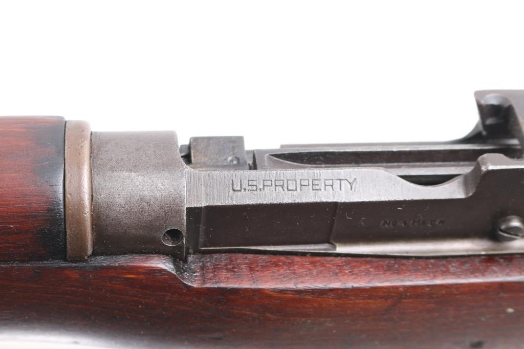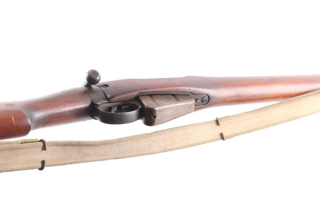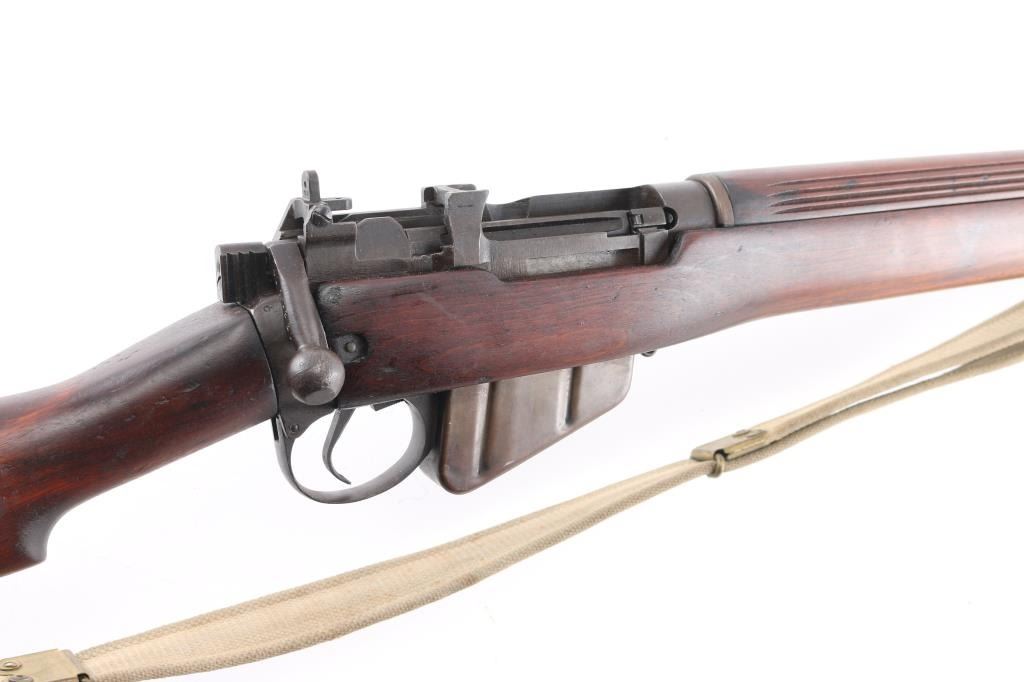 service rifle chambered in .303 British. Produced in the United States by Savage (C in serial number) as a No 4 Mk 1* (Star indicates simplified production in North America) for the war effort via the lend-lease program in 1943. 25.2" barrel with integral bayonet lugs, shrouded patridge front sight, receiver mounted flip-up aperture rear sight graduated to 1,300 yards, two barrel bands, smooth trigger, detachable 10 round magazine, manual safety on the left side of the receiver, integral charge loading guide cuts in the receiver, sling swivels, smooth full-length grooved wood handguard & forend, and straight grip shoulder stock with aluminum trapdoor buttplate. The left side of the receiver is marked "U.S.PROPERTY", “ No4 Mk1* left butt socket stamped with sn over large "S: and "1943", small flaming bomb on bayonet lug, and bolt. Rifle has a gray finish. Action is sound, the bore appears excellent/bright, and the wood stocks are very good/sound. No import marks. Comes with correct canvass sling.