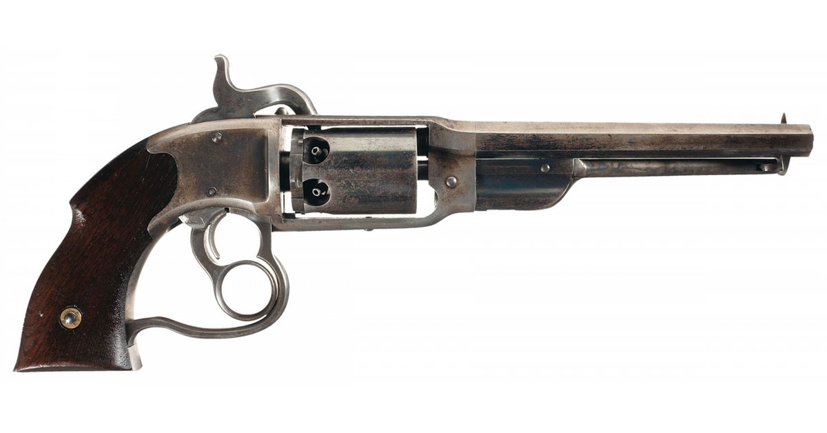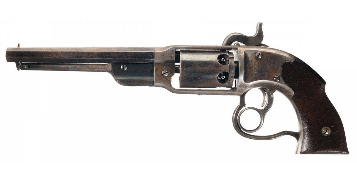 Pin front and notch rear sights, with the three-line Savage & North markings on the topstrap. The smooth grip panels show no cartouches. The barrel is numbered to the gun. Of the 2,000 Savage-North revolvers made, the majority were consumed by government contracts. Notes from the consignor attribute the revolver to the U.S.S. St. Lawrence, one of the vessels involved with the Battle of Hampton Roads, where the Merrimack (aka Virginia) and Monitor clashed in the first ironclad vs ironclad contest in naval history. We can not verify this information. However, the Armory Sub-Insepector M. Moulton's acceptance mark ("M") is stamped on the left side of the back strap under the grip panel and on the bottom barrel flat under the loading lever.
