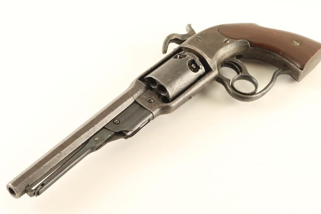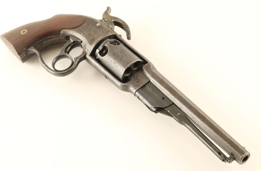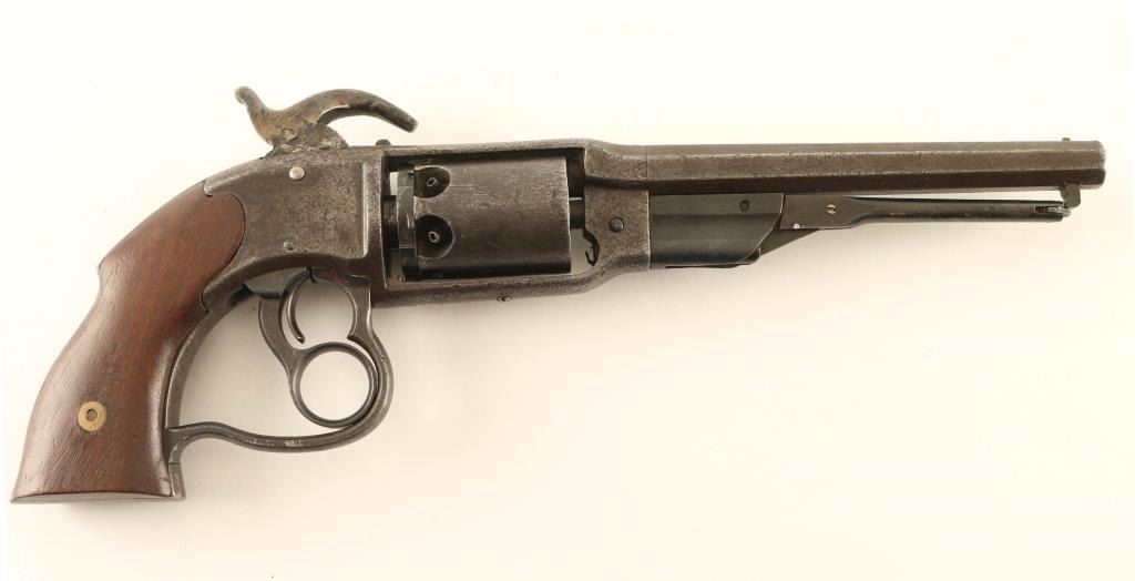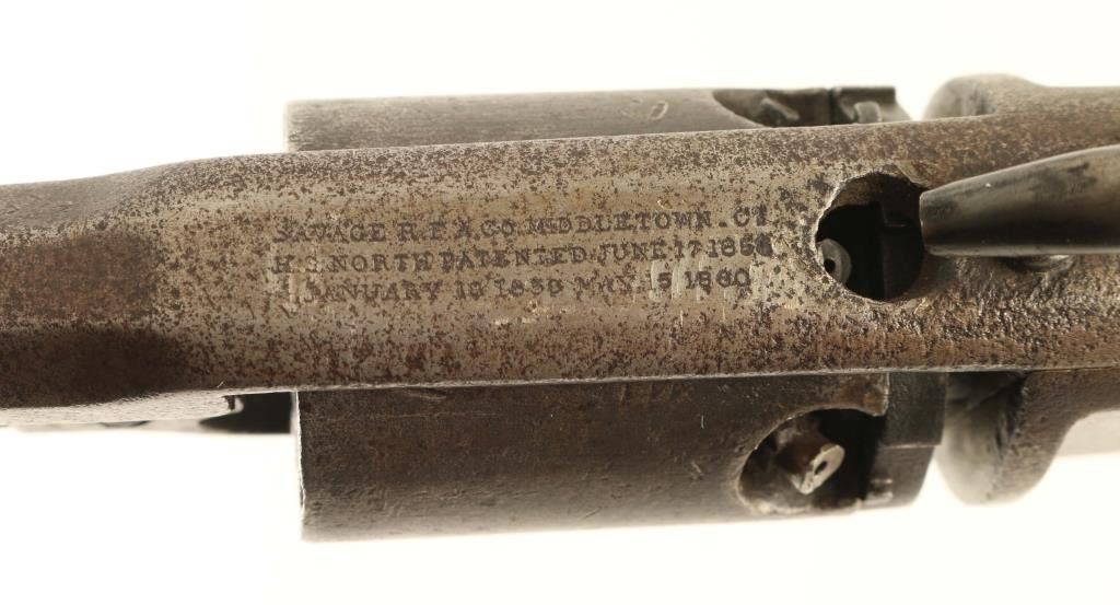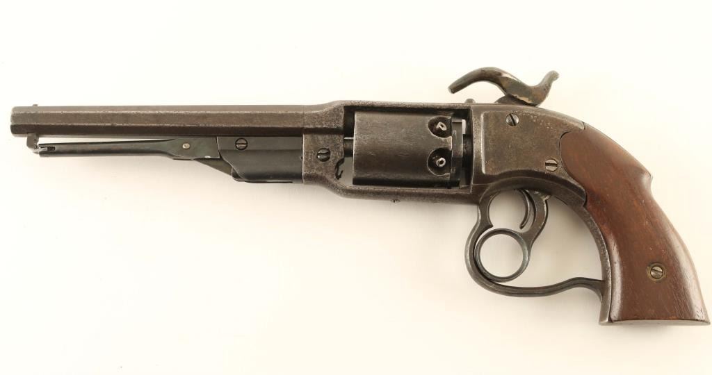 Martially marked antique lever action percussion revolver with .36 caliber bore, manufactured in Middletown, CT circa 1861-1865. The Union purchased just under 12,000 of these unique revolvers during the American Civil War for the Army & Navy. Features a 7" octagon barrel, short brass pinched post front sight, fixed 'v' notched rear sight, smooth trigger, ring lever, heart shaped trigger guard, repaired hammer with smooth spur, non-fluted six shot cylinder, loading lever and smooth walnut grips. Stamped with inspector mark "H" on the barrel. Revolver exhibits an aged brown patina with scattered pitting throughout. The loading lever displays a reblued finish. Action is mechanically sound, the bore is fair, the nipples are damaged, the markings are mostly visible and the wood grips are good. Condition is NRA Good. ***Antique Firearm***